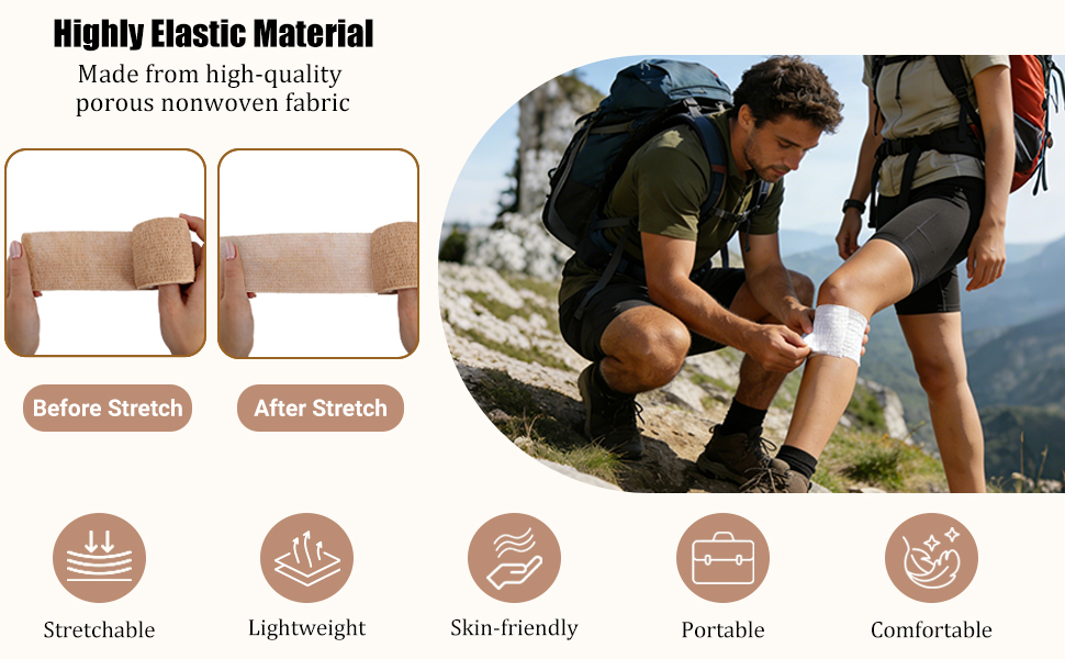 مرنة ومسامية: مصنوعة من قماش غير منسوج، تتميز الضمادات المرنة لدينا بملمس شريط رياضي، صديقة للبشرة، ومسامية. يعمل التمدد الجيد كغطاء للكاحل/المعصم، ويدعم الكاحل/المعصم الملتوي ويخفف الضغط، وهو مثالي لممارسة الرياضة.