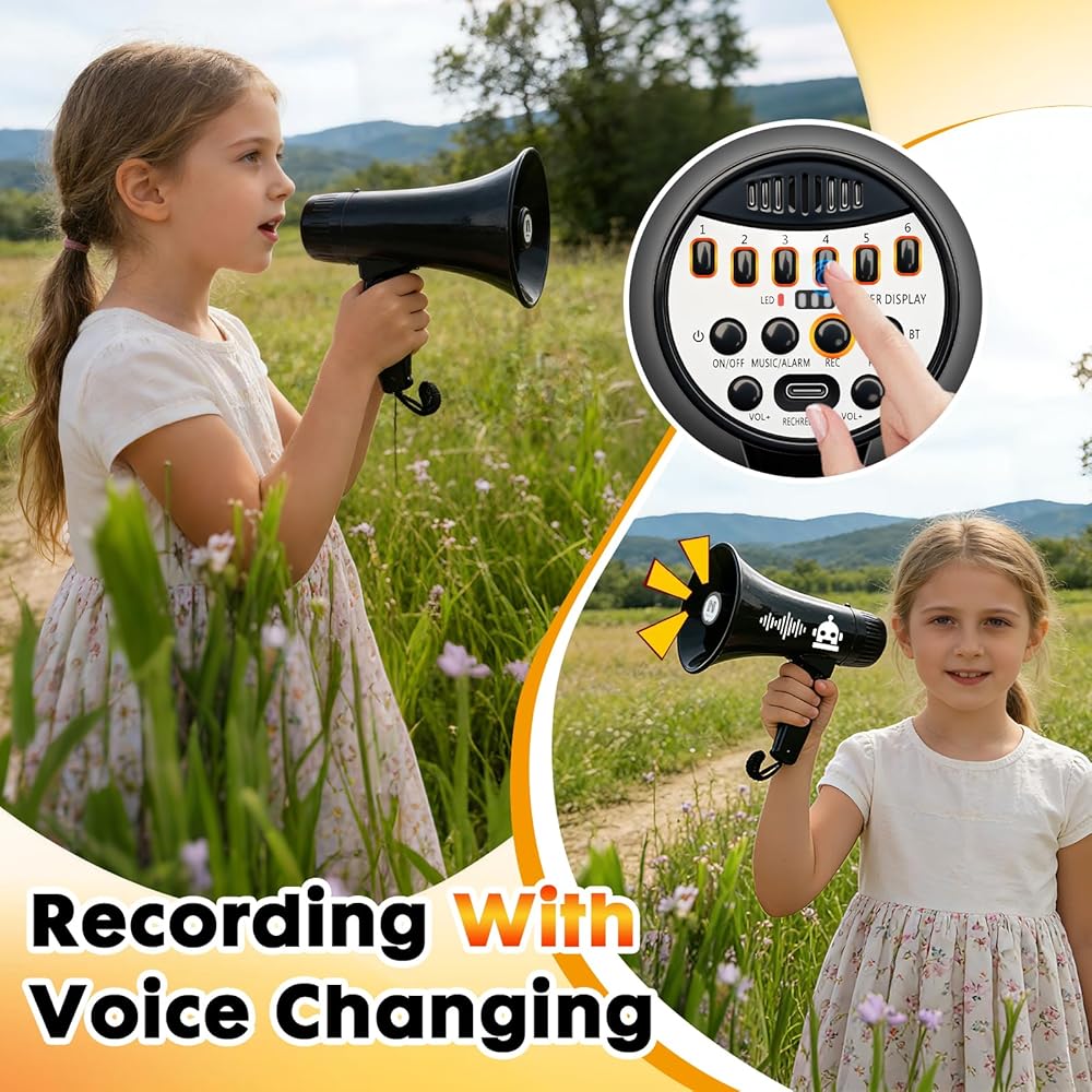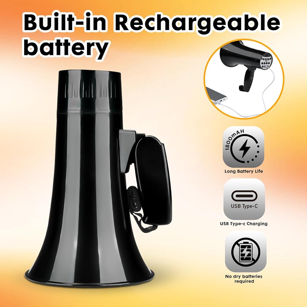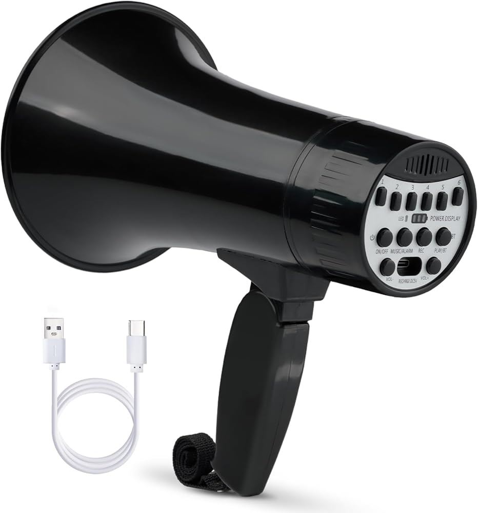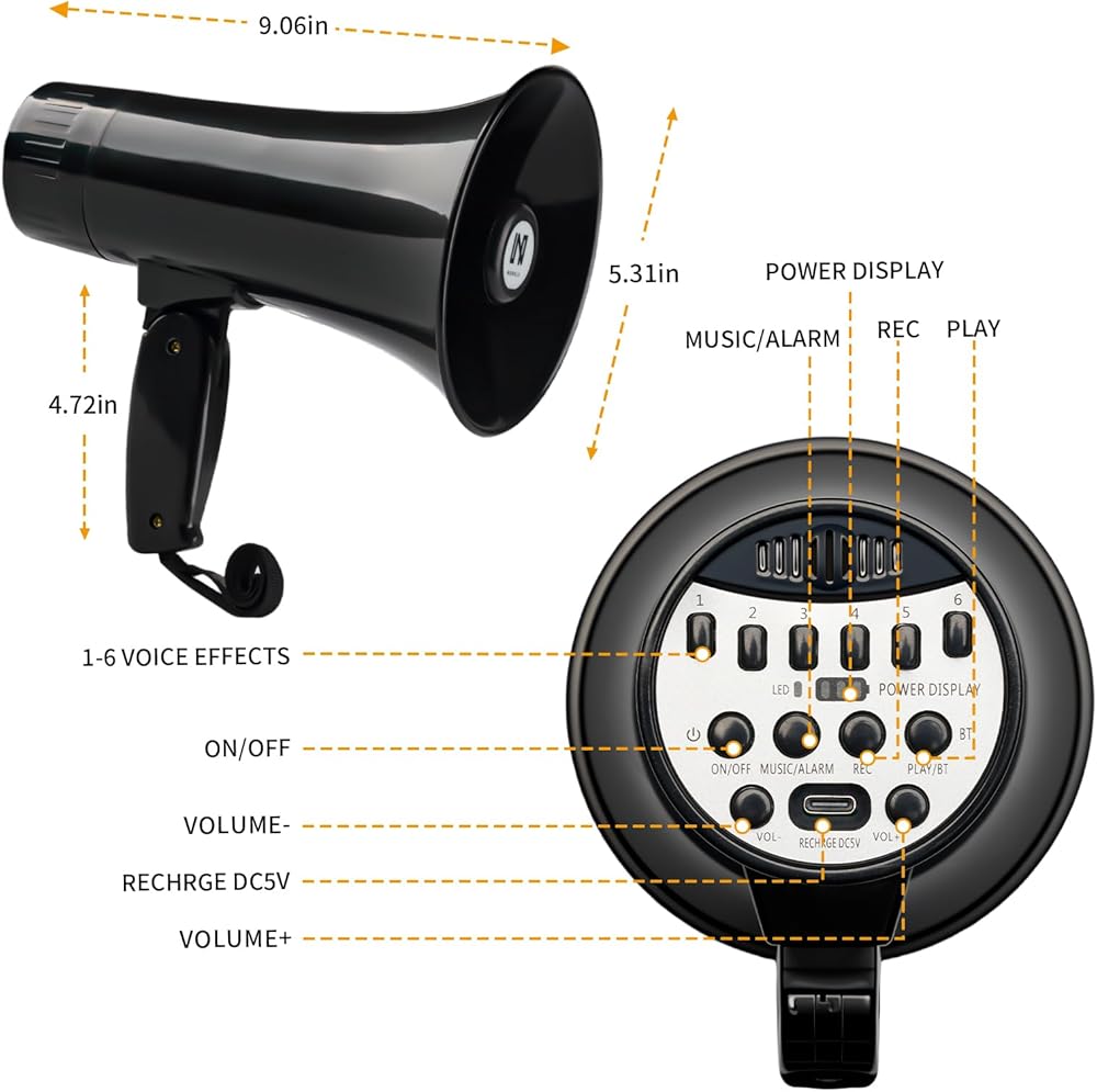 مكبر صوت مكبر صوت بولهورن بقدرة 20 وات، مكبر صوت بصوت عالٍ مع مغير صوت، صفارة إنذار وتسجيل مدمجة في هاتف ميجا، يدعم مدخل BT، لألعاب الحفلات والخارجية (أسود)