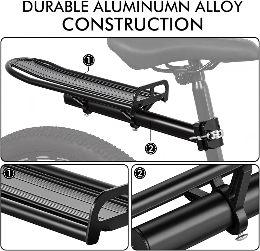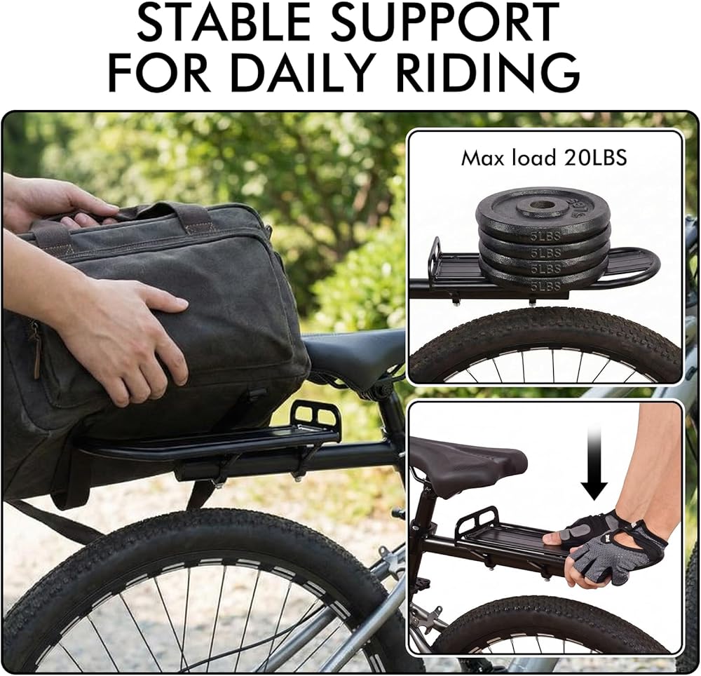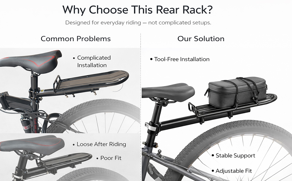 مستقر وآمن: يوفر هيكل الدعم المزدوج ونقاط التثبيت المعززة ثباتًا ممتازًا تحت الحمل. يبقى الرف الخلفي للدراجة ثابتًا في مكانه أثناء الركوب، مما يقلل من التذبذب ويحسن السلامة على الطرق غير المستوية.