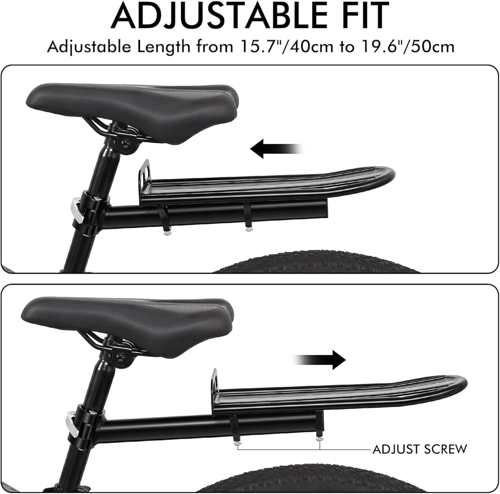 هيكل قابل للتعديل: رف دراجة خلفي قابل للتعديل مع تصميم منصة قابلة للتمدد، مما يسمح لك بضبط الطول والزاوية لتحسين توازن الحمل وراحة الركوب. مثالية للتنقل اليومي أو المهمات أو الرحلات الخفيفة.