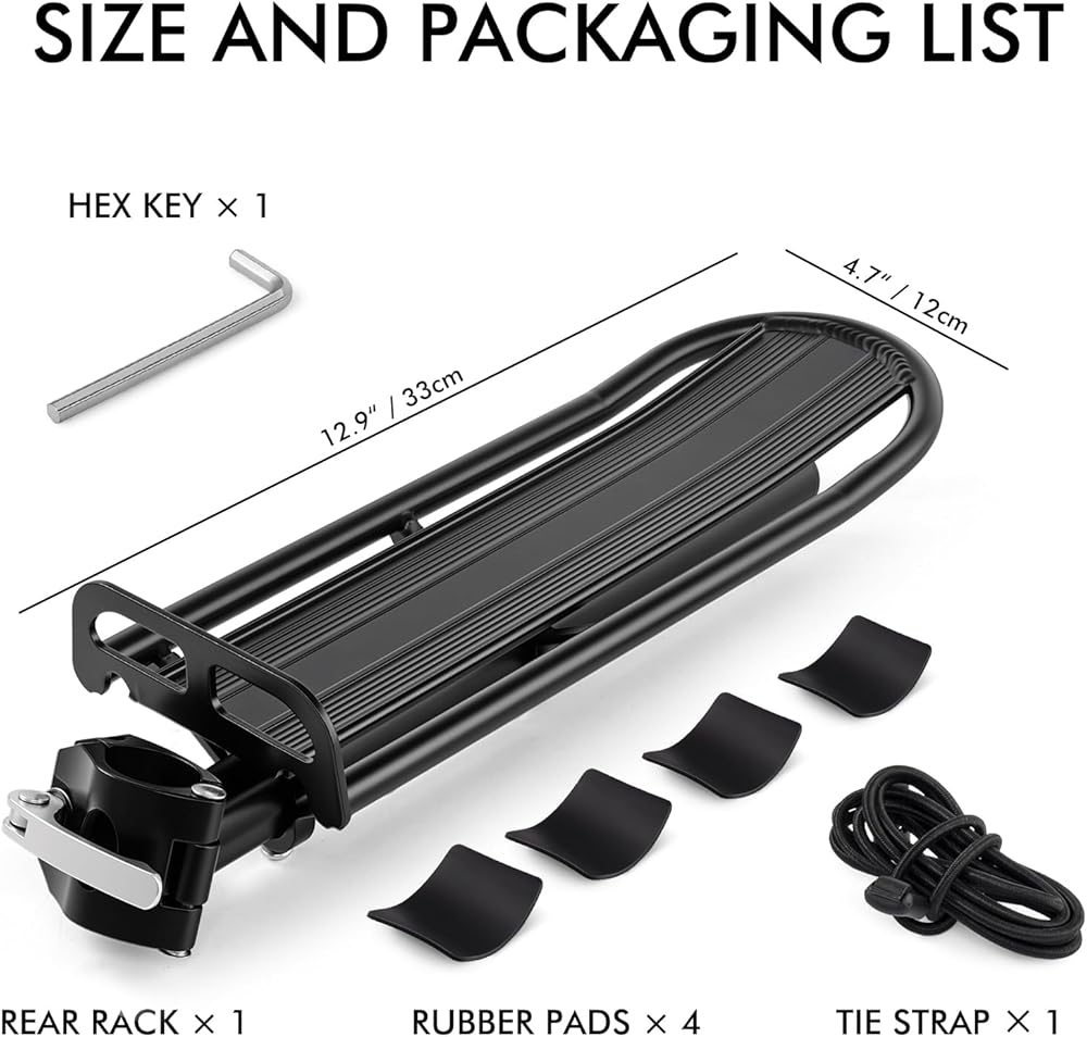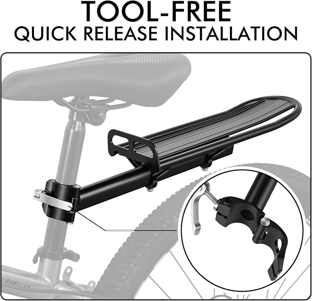 التثبيت السريع والإزالة السهلة: يتميز الرف الخلفي للدراجة بتصميم مثبت على عمود المقعد يتم تركيبه مباشرة على الدراجة دون حفر أو تعديل دائم. يسمح هيكل المشبك سريع التحرير بالتركيب والإزالة بسرعة باستخدام مفتاح الربط الصغير المتضمن.