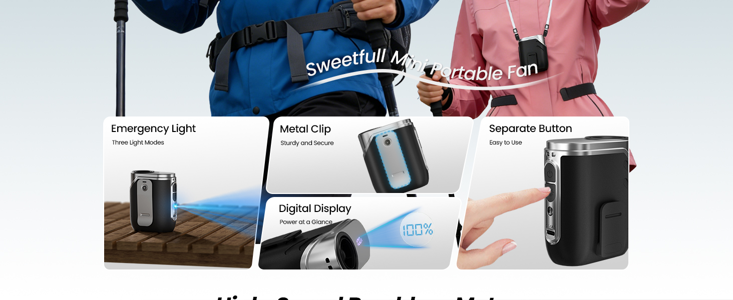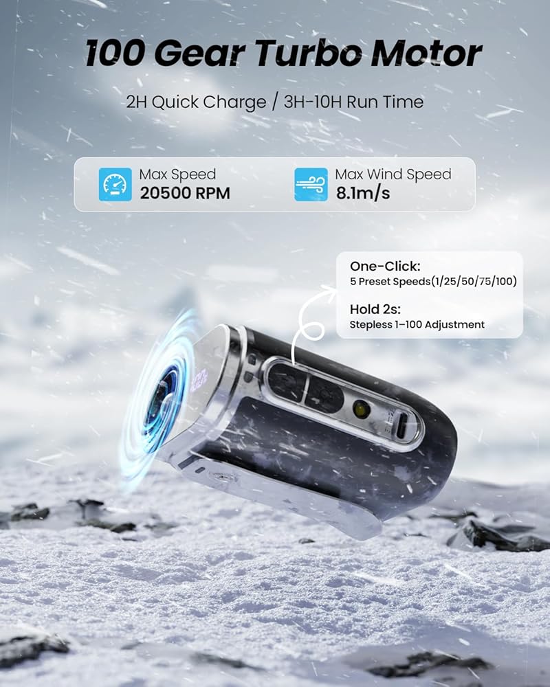تدفق هواء توربو 20500 دورة في الدقيقة: 3.1 أضعاف عدد الدورات في الدقيقة للمراوح المحمولة العادية. مع محرك عالي السرعة بدون فرش و9 شفرات توجيه، فإنه ينتج رياح تبريد قوية تبلغ 26 قدم/ثانية لتبريد فعال.