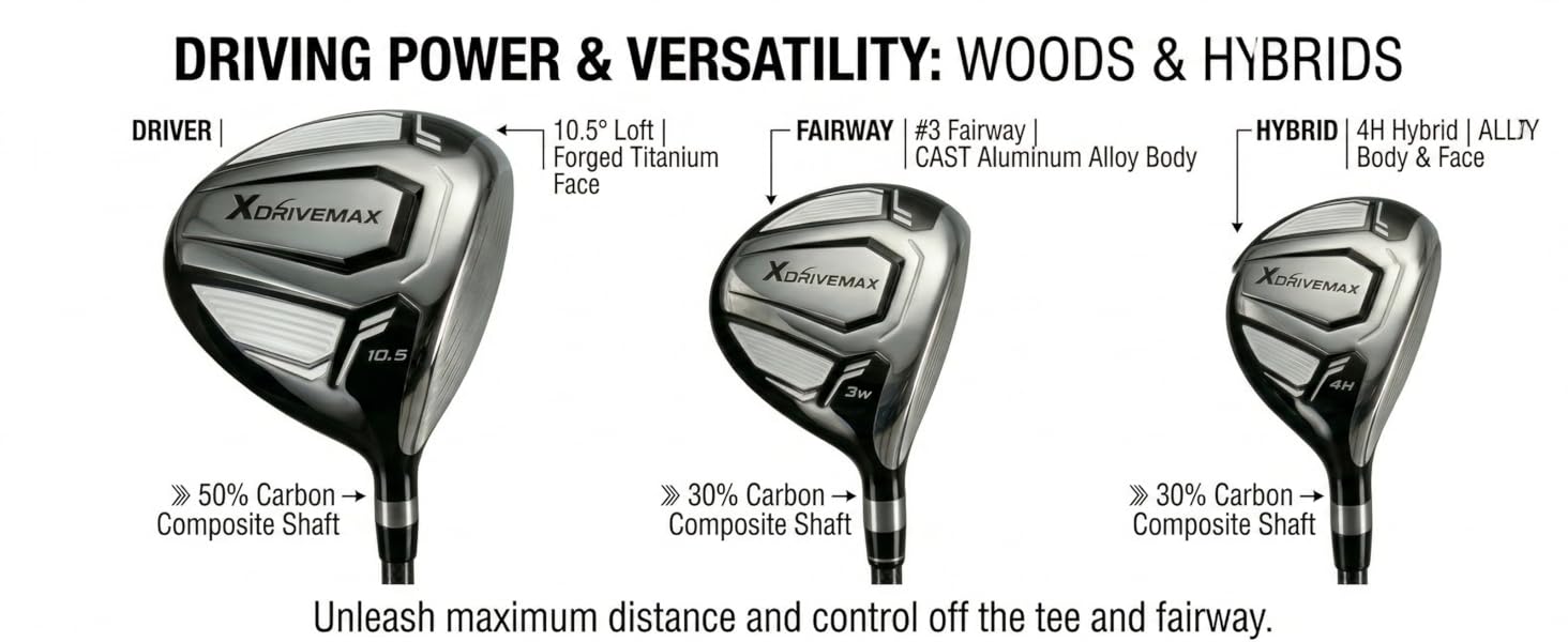 • مجموعة نوادي الجولف للمبتدئين للرجال الذين يستخدمون اليد اليمنى: مثالية كمجموعة نوادي جولف للمبتدئين للرجال، تم تصميم نوادي الجولف الخاصة بنا للرجال لتحقيق أقصى قدر من التسامح. يتميز السائق بعمود مركب من ألياف الكربون بنسبة 50% لزيادة سرعة التأرجح، بينما تساعدك الأخشاب الديناميكية الهوائية على تحقيق لقطات أكثر استقامة وأطول من نقطة الإنطلاق أو الممر. مثالية لأولئك الذين ينتقلون من نوادي الجولف المستعملة إلى مجموعة جديدة من الدرجة الاحترافية.