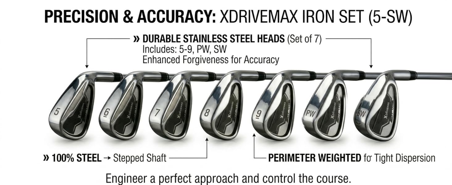 • مكواة دقيقة من الفولاذ المقاوم للصدأ: قلب مجموعات الجولف هذه للرجال هو مجموعة الحديد المصنوعة من الفولاذ المقاوم للصدأ المصبوبة بدقة (5، 6، 7، 8، 9، PW، SW). على عكس مضارب الجولف القياسية للرجال، تستخدم مكاوينا أعمدة فولاذية متدرجة لتحقيق ثبات وردود فعل فائقين. توفر مجموعة مضارب الجولف الرجالية الكاملة هذه التي تستخدم اليد اليمنى التحكم المتسق اللازم لتقليل إعاقتك وإتقان كل لقطة.