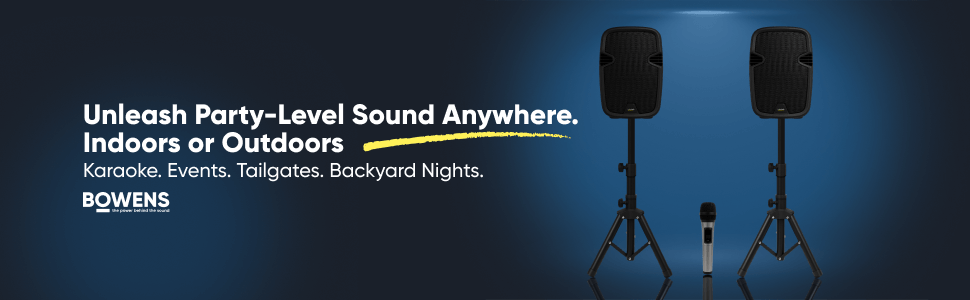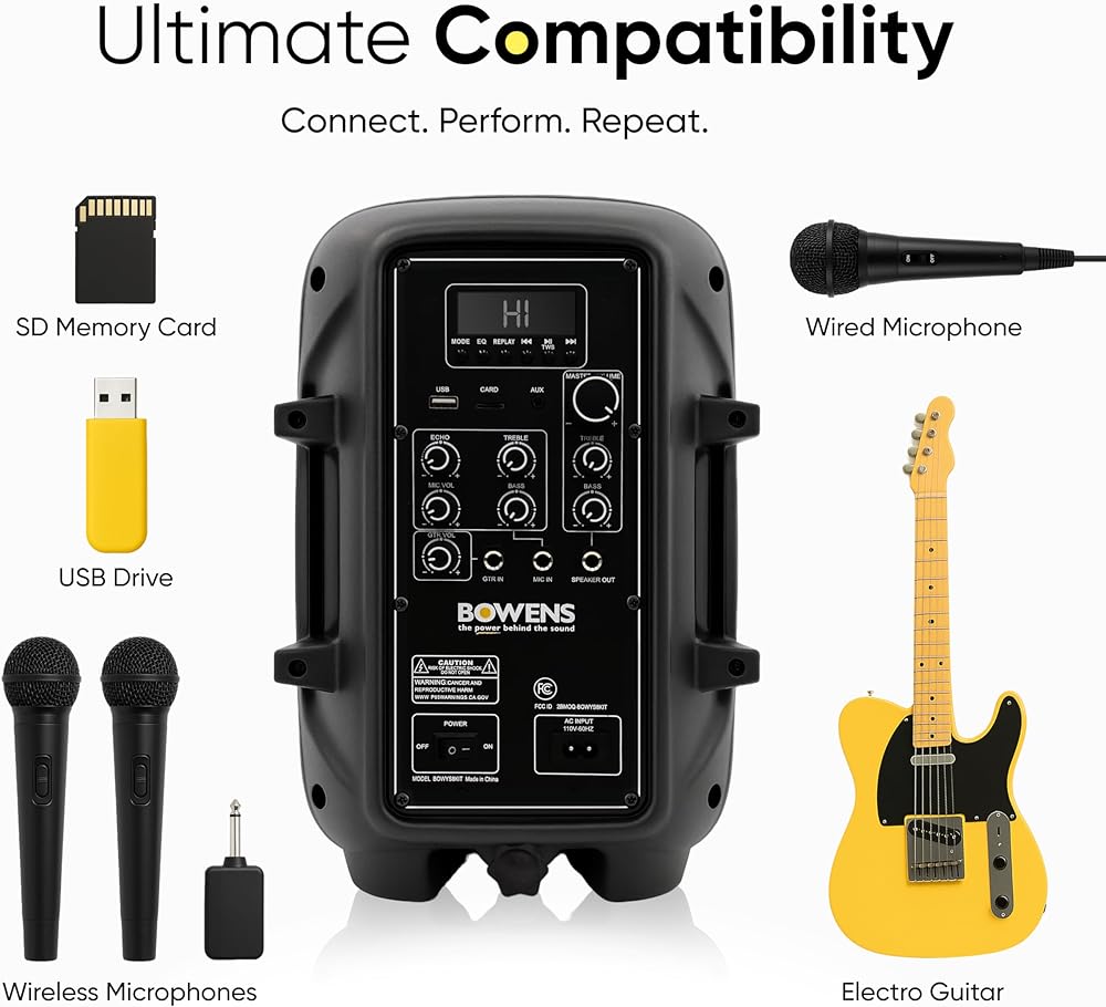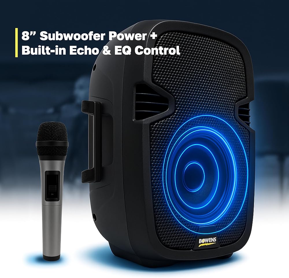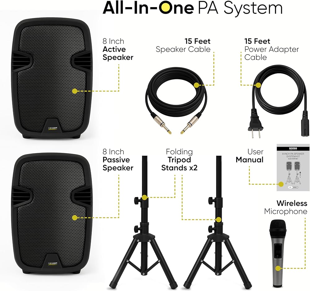 مجموعة سماعات بلوتوث PA مقاس 8 بوصات من Bowens - مكبرات صوت محمولة وميكروفون لاسلكي بلوتوث مع حامل وكابل - مكبر صوت للحفلات ومكبرات صوت DJ ونظام صوت خارجي، مجموعة نظام PA للمناسبات، كاريوكي
