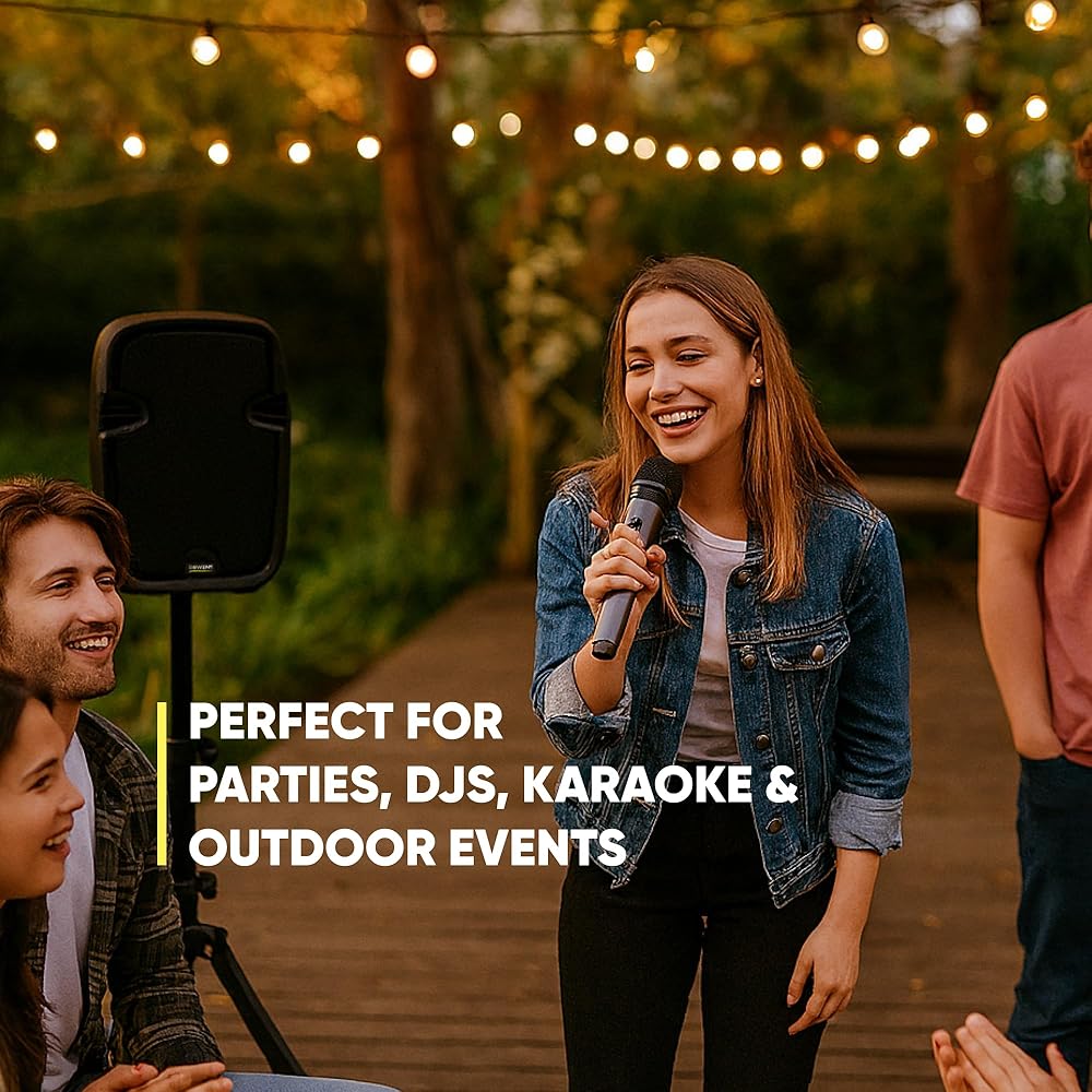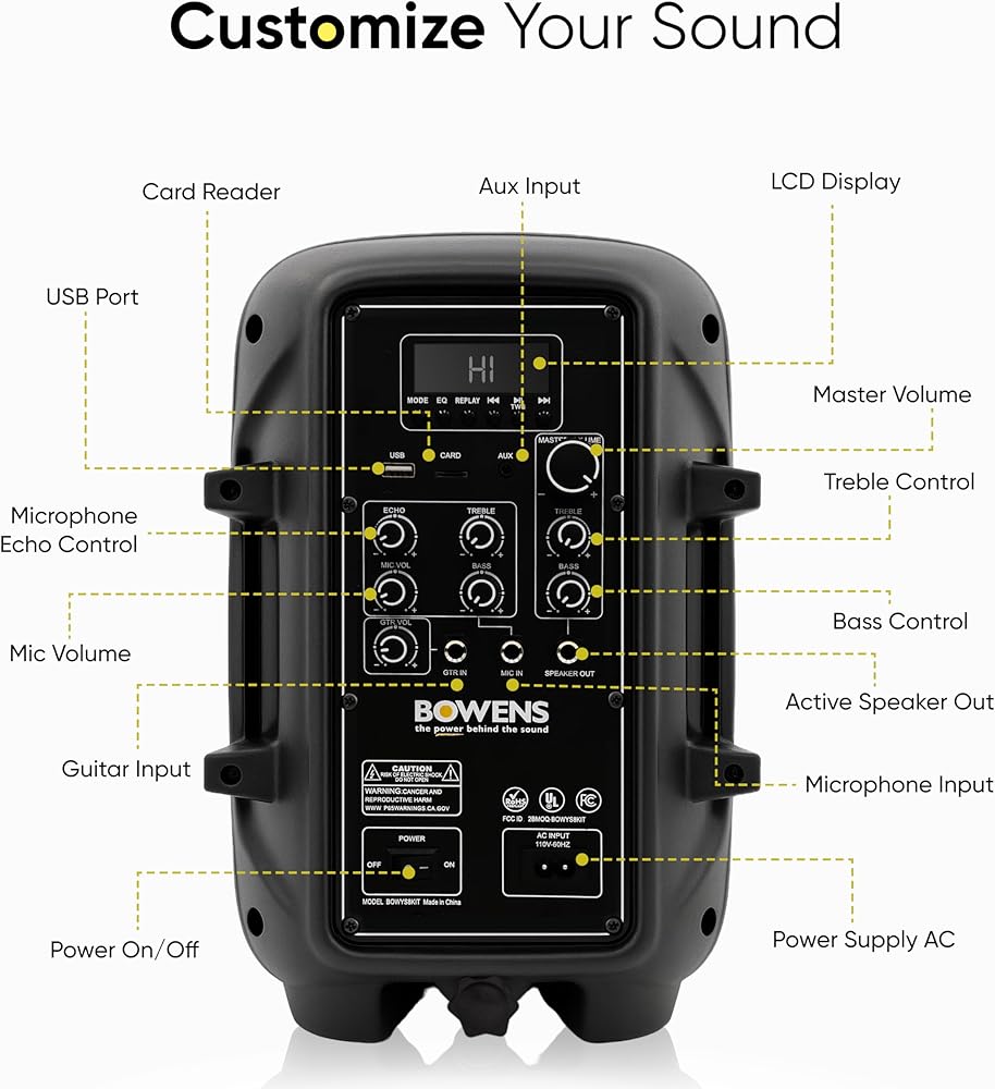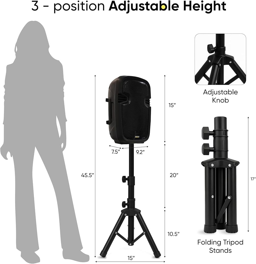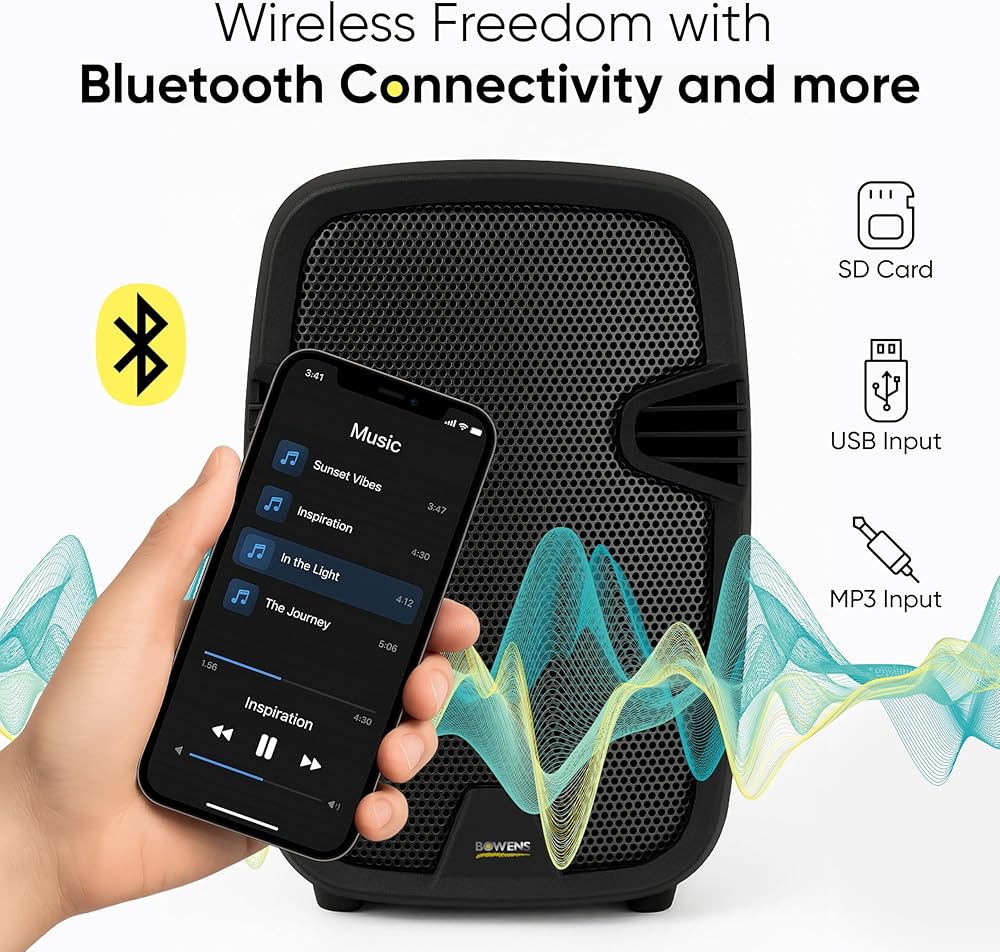 مجموعة سماعات بلوتوث PA مقاس 8 بوصات من Bowens - مكبرات صوت محمولة وميكروفون لاسلكي بلوتوث مع حامل وكابل - مكبر صوت للحفلات ومكبرات صوت DJ ونظام صوت خارجي، مجموعة نظام PA للمناسبات، كاريوكي