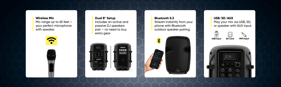 نظام PA الخارجي النهائي لمنسقي الأغاني وفناني الأداء. توفر مجموعة مكبرات الصوت DJ الكاملة هذه تأثيرًا خطيرًا. مع مكبرات صوت DJ اللاسلكية بتقنية Bluetooth للميكروفون الخاص بك وإعداد مكبر الصوت السلكي، يمكنك الحصول على طاقة موثوقة وصوت غني في كل مرة.
