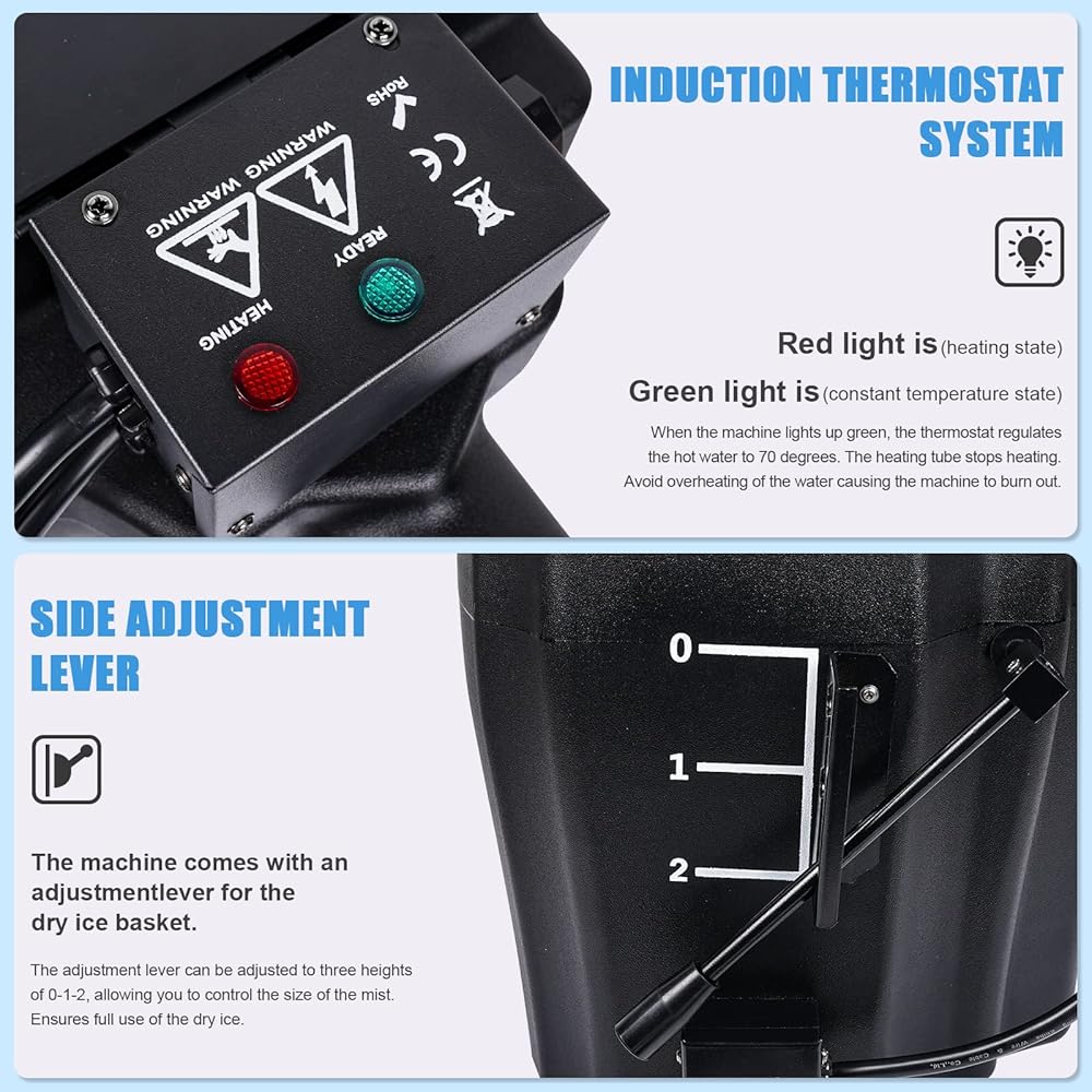 • تشغيل سهل: خطوات استخدام قاذف الثلج الجاف هي ببساطة إضافة الماء، وتوصيله وتشغيل الطاقة. بمجرد أن يصبح مستوى الماء كافيًا ويتم تسخين الماء، أضف الثلج الجاف. يمكن تعديل كمية الدخان بواسطة المقبض. هذا التصميم البديهي خطوة بخطوة يعني أنه يمكنك الإعداد بسرعة دون أي متاعب تقنية، مما يوفر وقتًا ثمينًا حتى تتمكن من التركيز على ترفيه ضيوفك