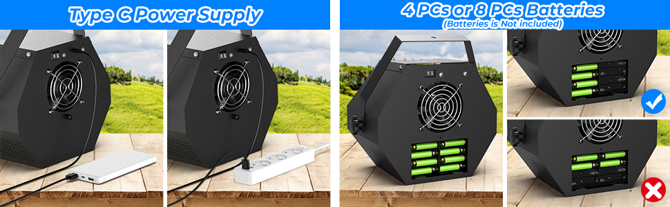 • يعمل بطريقتين: يمكن تشغيل منفاخ الفقاعات بـ 4 أو 8 بطاريات (غير متضمنة) أو توصيل بكابل USB من النوع C المتضمن، مما يوفر أقصى قدر من الراحة لك ويتيح لك الاستمتاع بآلة الفقاعات في الداخل والخارج. للحصول على تجربة جيدة في جو الفقاعات، نوصي باستخدام 8 بطاريات أو توصيل USB بمصدر طاقة.
