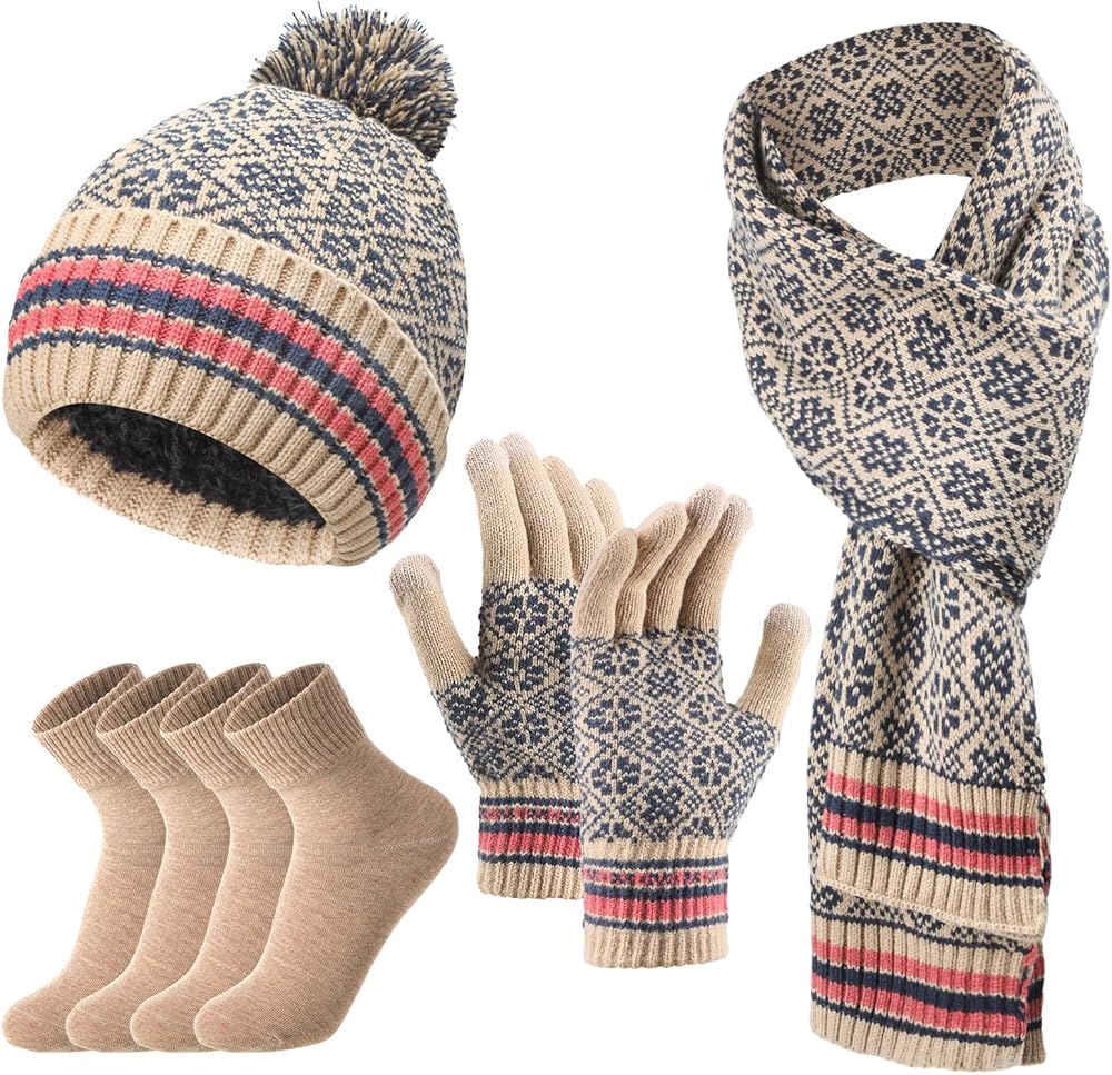 بدلة شتوية دافئة: احصل على قطعة واحدة من القبعة المحبوكة، وقطعة واحدة من الوشاح، وزوج واحد من قفازات شاشة اللمس، وزوجين من الجوارب، وقطعة واحدة من كمامة الأذن الصوفية الدافئة، وهو مزيج مدروس، ويوفر الحماية الكاملة في البرد شتاء