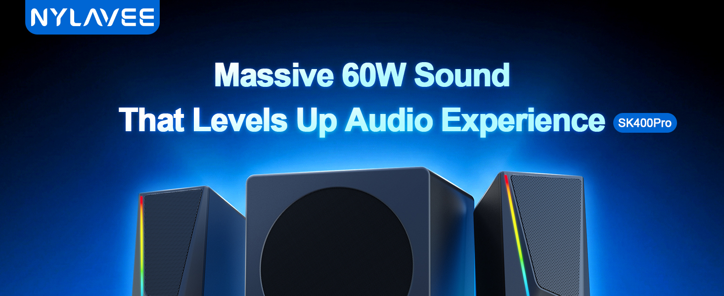 سماعات كمبيوتر Nylavee مع مضخم صوت، نظام مكبرات صوت 2.1 للكمبيوتر الشخصي مع 8 أوضاع إضاءة، طاقة ذروة 60 وات، محول تيار متردد، بلوتوث 5.4، USB/USB-C و3.5 مم مدخل Aux لسطح المكتب والشاشة والألعاب