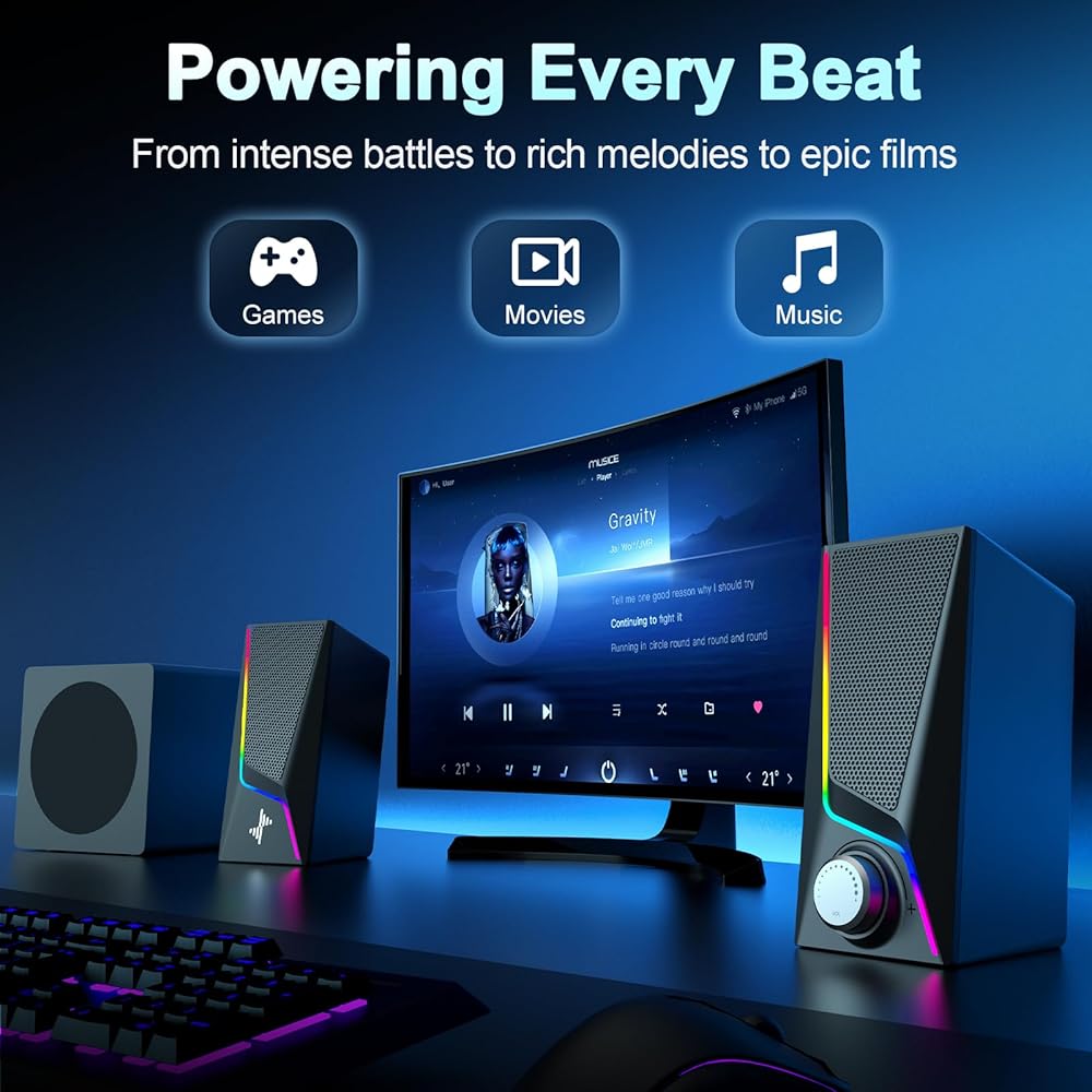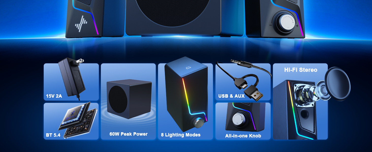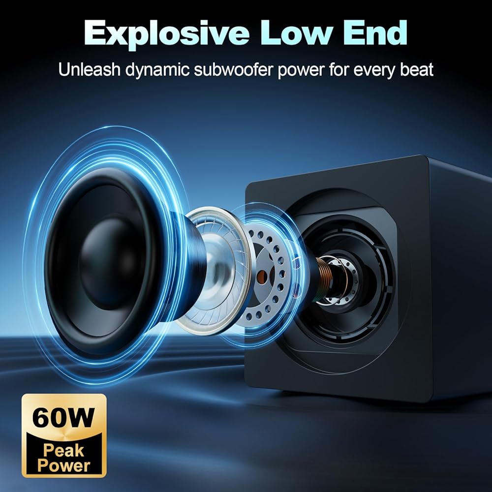 【صوت ستيريو 2.1 قناة 60 وات】 استمتع بتجربة مكبرات صوت كمبيوتر 2.1 قوية مع طاقة ذروة تصل إلى 60 وات للحصول على صوت يملأ الغرفة. توفر مكبرات الصوت للكمبيوتر الشخصي المزودة بمضخم صوت صوتًا متوسطًا واضحًا وأعلى مستويات الوضوح وصوتًا خاليًا من التشوهات للألعاب والأفلام والموسيقى على أي إعداد لسطح المكتب