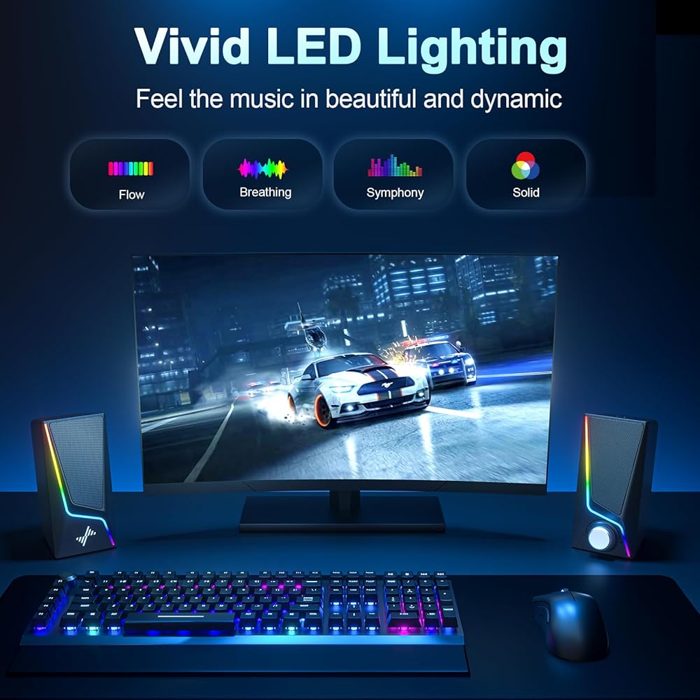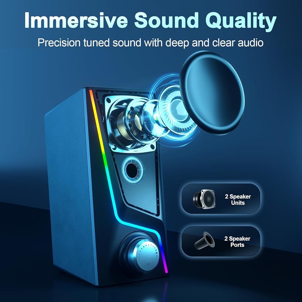 【إضاءة RGB الديناميكية والتحكم باللمس】تم تصميم نظام السماعات المكتبي هذا ليكون مكبرات صوت للكمبيوتر الشخصي للألعاب، ويتميز بـ 8 أوضاع RGB ديناميكية و4 مستويات سطوع. قم بتخصيص إضاءة الإعداد الخاصة بك لتتناسب مع جهازك وإنشاء بيئة معركة غامرة