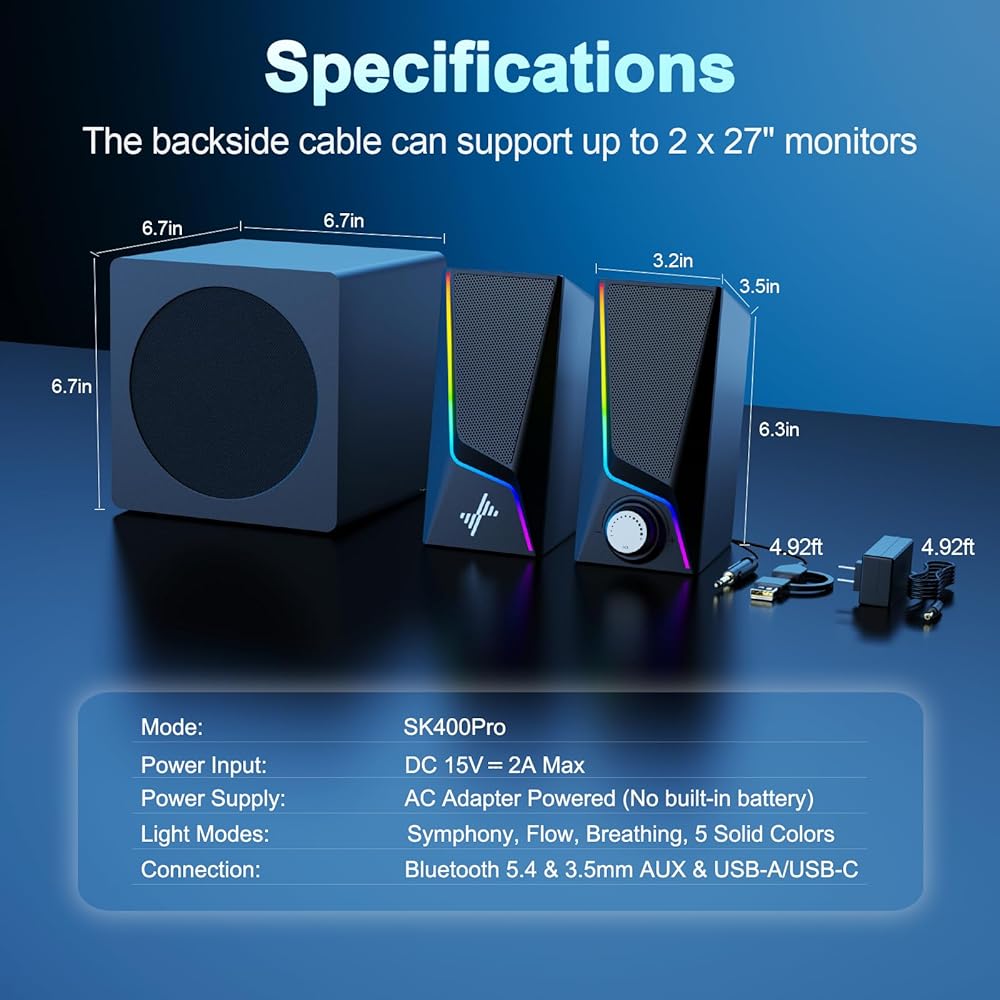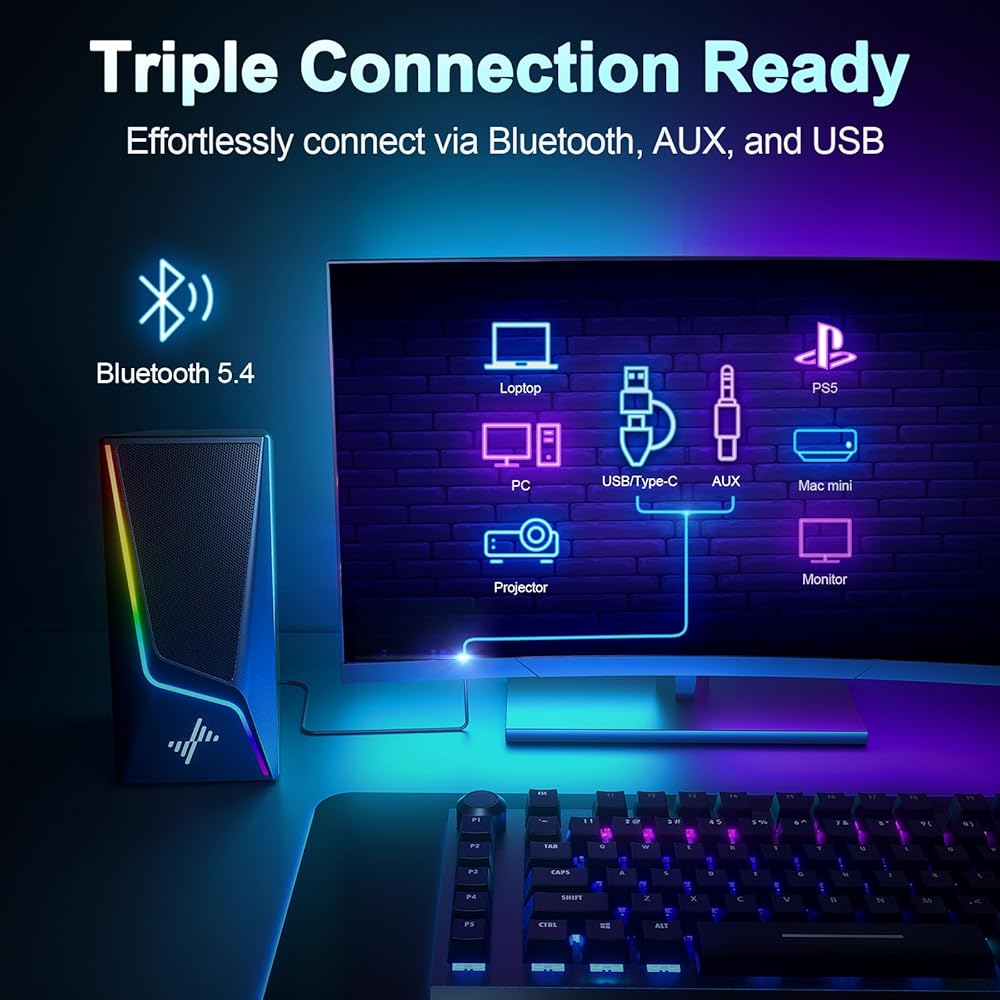 【اتصال ثلاثي وتوافق واسع】تدعم مكبرات صوت الكمبيوتر التي تعمل بتقنية البلوتوث USB وAUX وBluetooth 5.4. استخدمها كمكبرات صوت سلكية للألعاب بدون زمن استجابة أو اتصل لاسلكيًا بأجهزة الكمبيوتر المحمولة والهواتف. يضمن مكبر الصوت المدمج المزود بمدخل AUX توافقًا واسعًا مع الشاشات وأجهزة الكمبيوتر