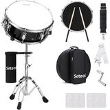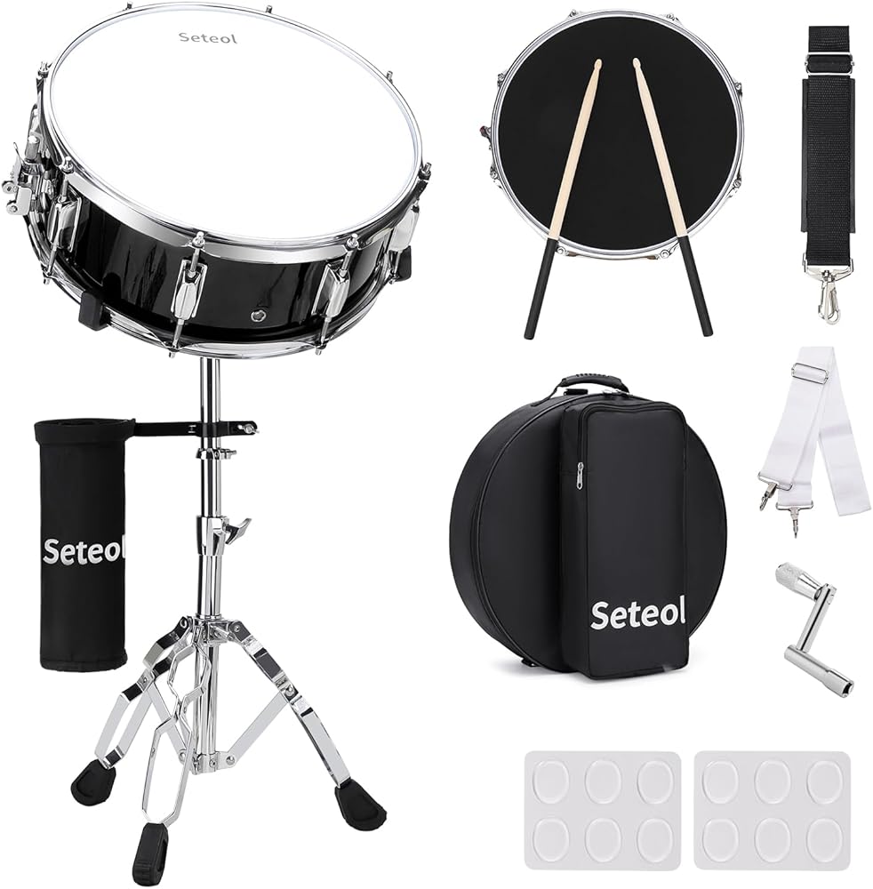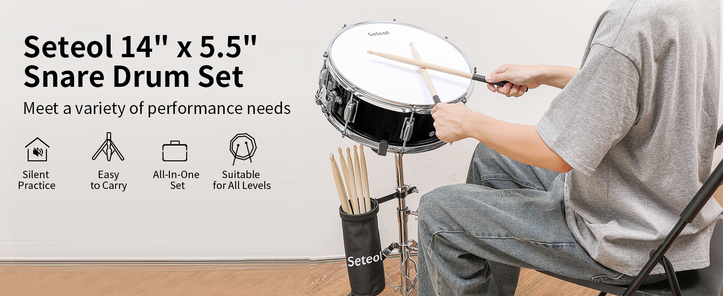 مجموعة الطبول المثالية الكل في واحد - تتضمن هذه المجموعة الاحترافية الكل في واحد كل ما تحتاجه: طبلة فولاذية مقاس 14 × 5.5 بوصة مع حامل قوي، وحقيبة مبطنة واقية، وزوج من أعواد الطبل 5A مع حامل، بالإضافة إلى ملحقات إضافية - لوحة تدريب صامتة (تقليل الضوضاء بنسبة 95%) و12 قطعة من مخمدات الجل الفاخرة للتحكم في الصوت. مثالية لكل من الأداء الحي والتمرين المنزلي الهادئ.