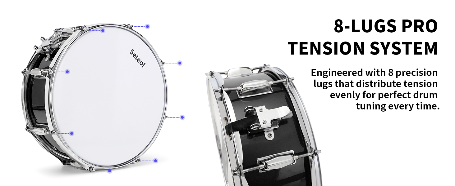 【طبل كمين مقاس 14 × 5.5 بوصة】تتميز هذه الطبلة المخصصة للاستوديو بنظام عروة عالي التحمل من 10 نقاط لتوتر الرأس المتوازن تمامًا، جنبًا إلى جنب مع رأس طبلة مطلية بالريمو بسمك 1.5 مم وحلقة 2.5 سم محسنة للرنين لإسقاط قوي. يجمع البناء الهجين بين حلقة ألومنيوم للطائرة مع غلاف من خشب القيقب مكون من 5 طبقات، مما يوفر نغمات دافئة رنانة مع ثبات ضبط استثنائي - مما يجعلها متساوية في المنزل في العروض الحية وجلسات الاستوديو.