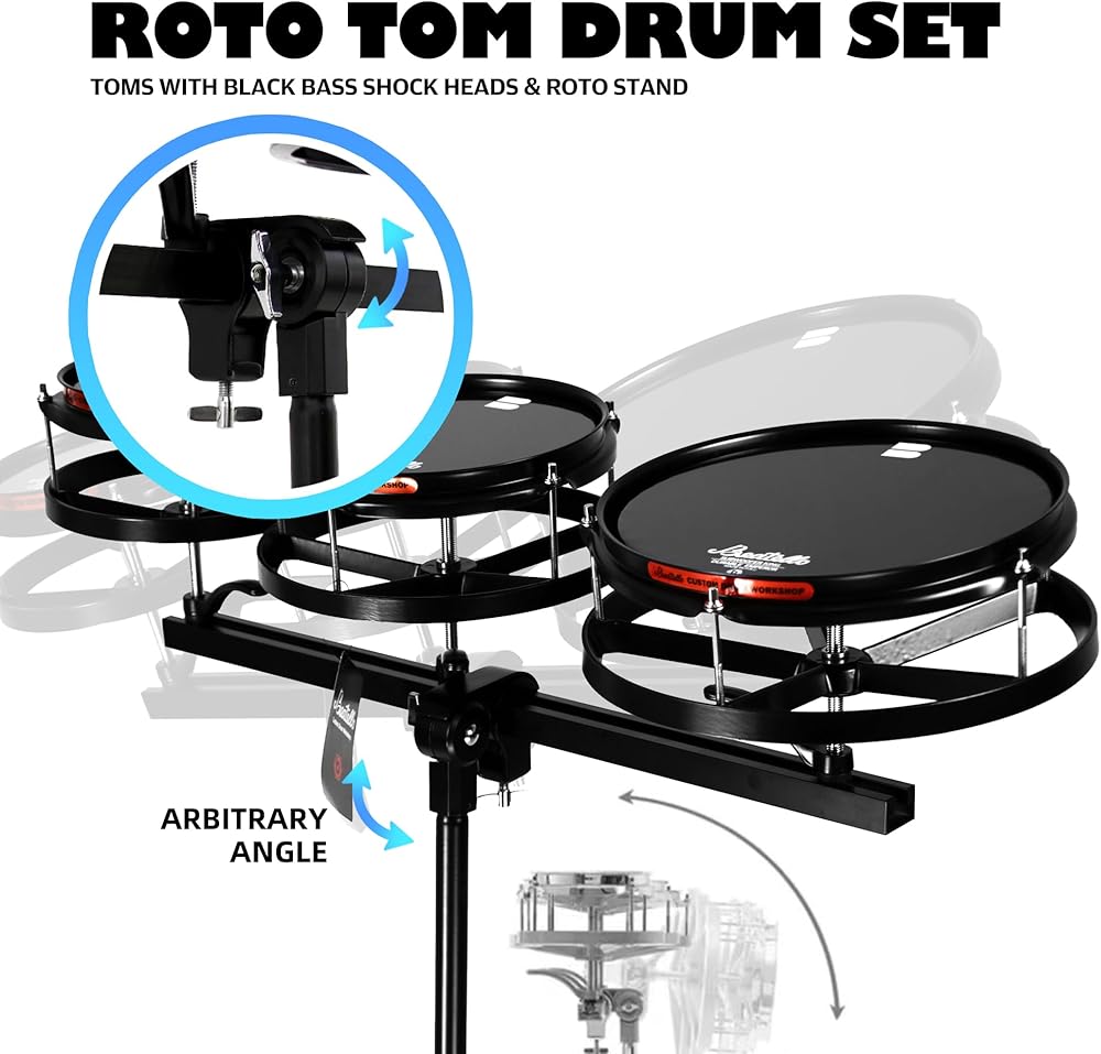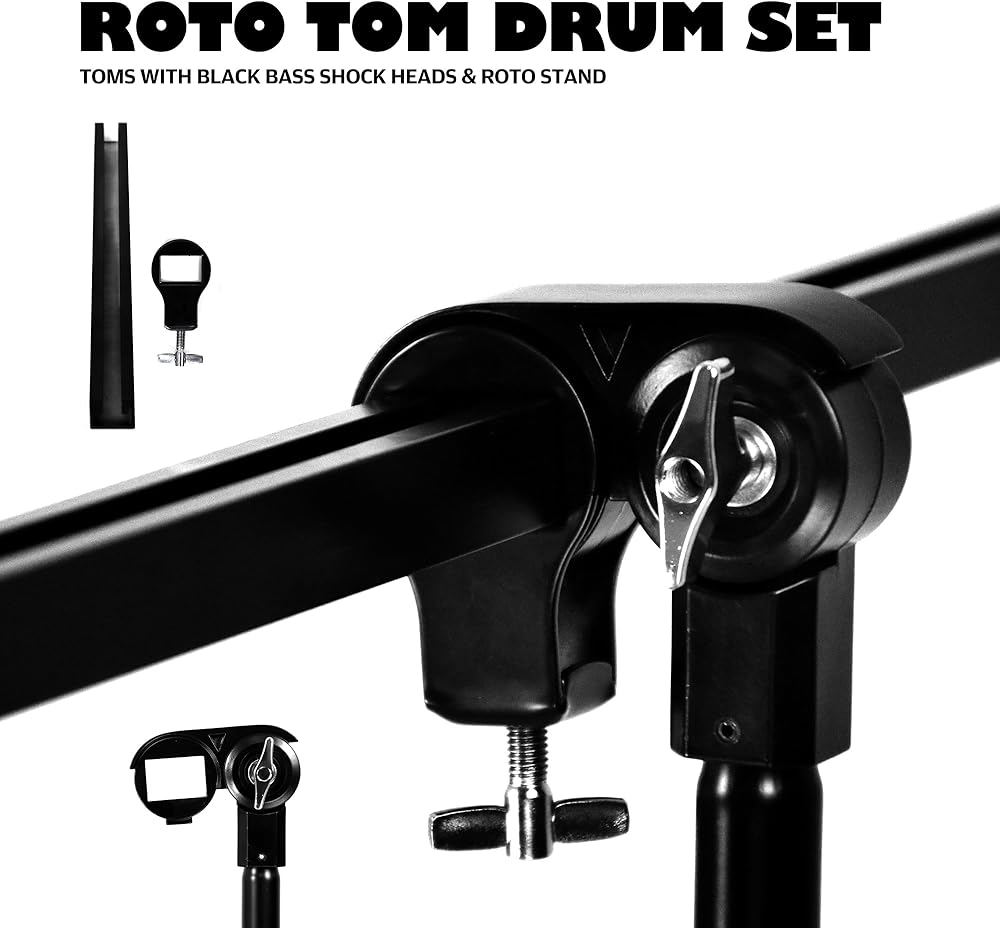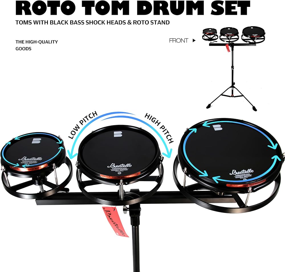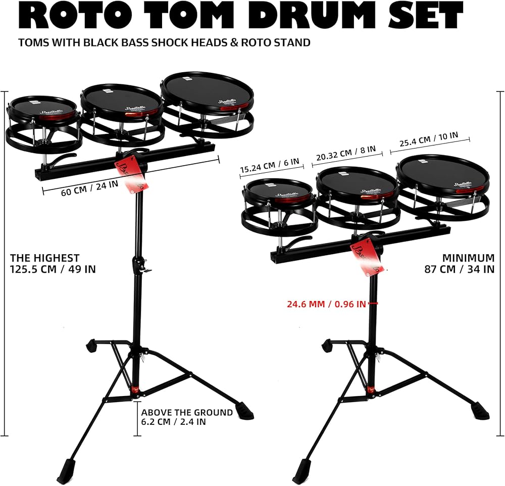 مجموعة طبول روتو توم، ضبط سريع وسهل بدون أدوات، درجة صوت متغيرة، نغمات متنوعة، تركيب سريع، ثلاثة طبول على حامل مخصص، ارتفاع قابل للتعديل. مع حامل 6 بوصات 8 بوصات 10 بوصات