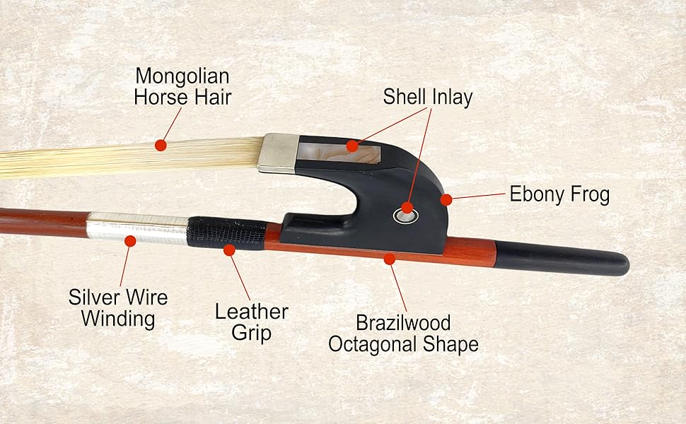 صناعة متقنة ~ مصنوعة يدويًا على يد صانعي القوس المتمرسين. مصنوع من الخشب البرازيلي. والنتيجة هي قوس جميل الشكل يوفر جودة لونية ممتازة.