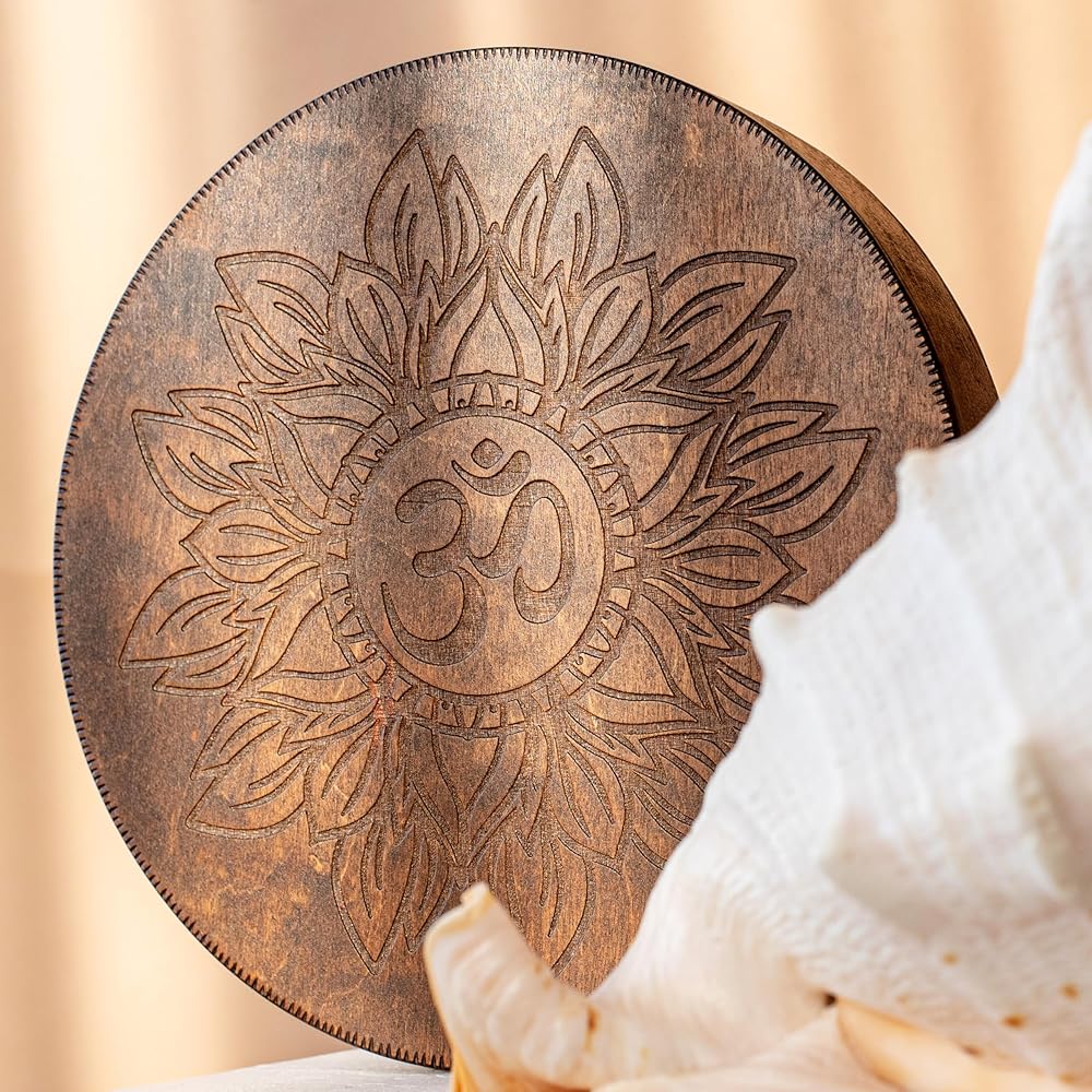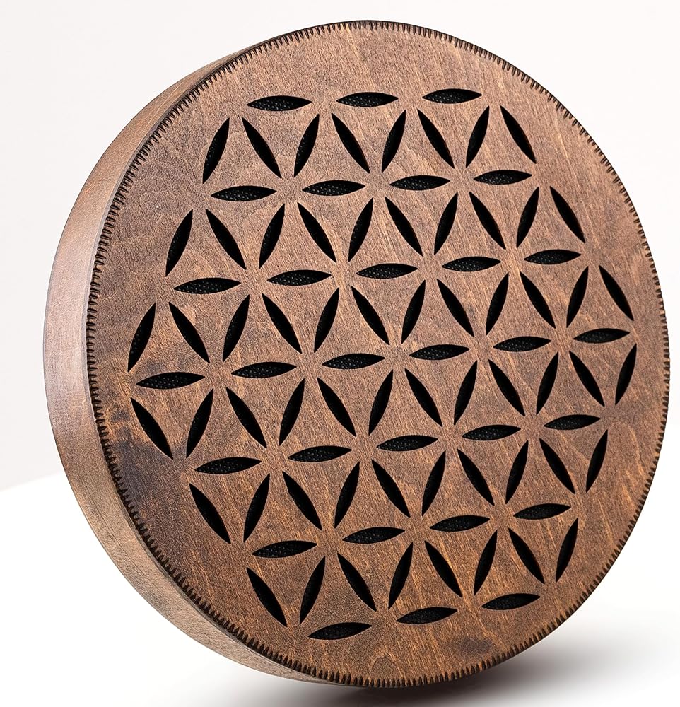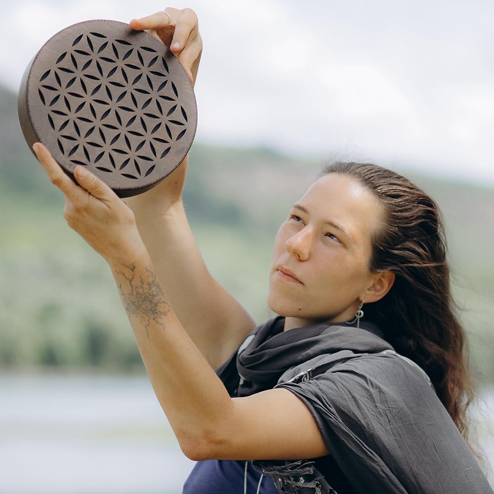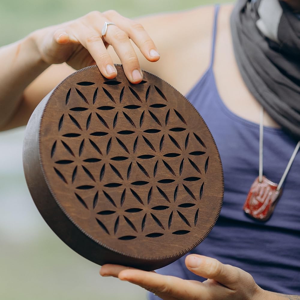 Nazar Drums Rain Disc is a handmade 8.6 inch (22 cm) wooden sound healing instrument that creates a soft rain-like flowing sound through gentle tilting and rotating movement. It is designed for meditation, yoga, relaxation, sound baths, breathwork, and calming home ambience. This Flower of Life & AUM version features a sacred geometry inspired design that gives the instrument a symbolic and meditative handmade look while keeping the same soothing Rain Disc sound. Compared to our Water-Fall Disc, the Rain Disc has a lighter, more delicate rain / creek-like sound character. Each piece is handmade, so slight natural variations make every instrument unique.