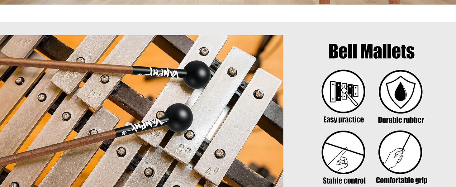 توافق واسع للقرع: مطارق إيقاع مثالية للتدريب والأداء على الأدوات مثل إكسيليفون، والغلوكنسبيل، ومجموعة الجرس، وطبل اللسان الفولاذي، ووسادة التدريب، وغيرها من أدوات النقر.