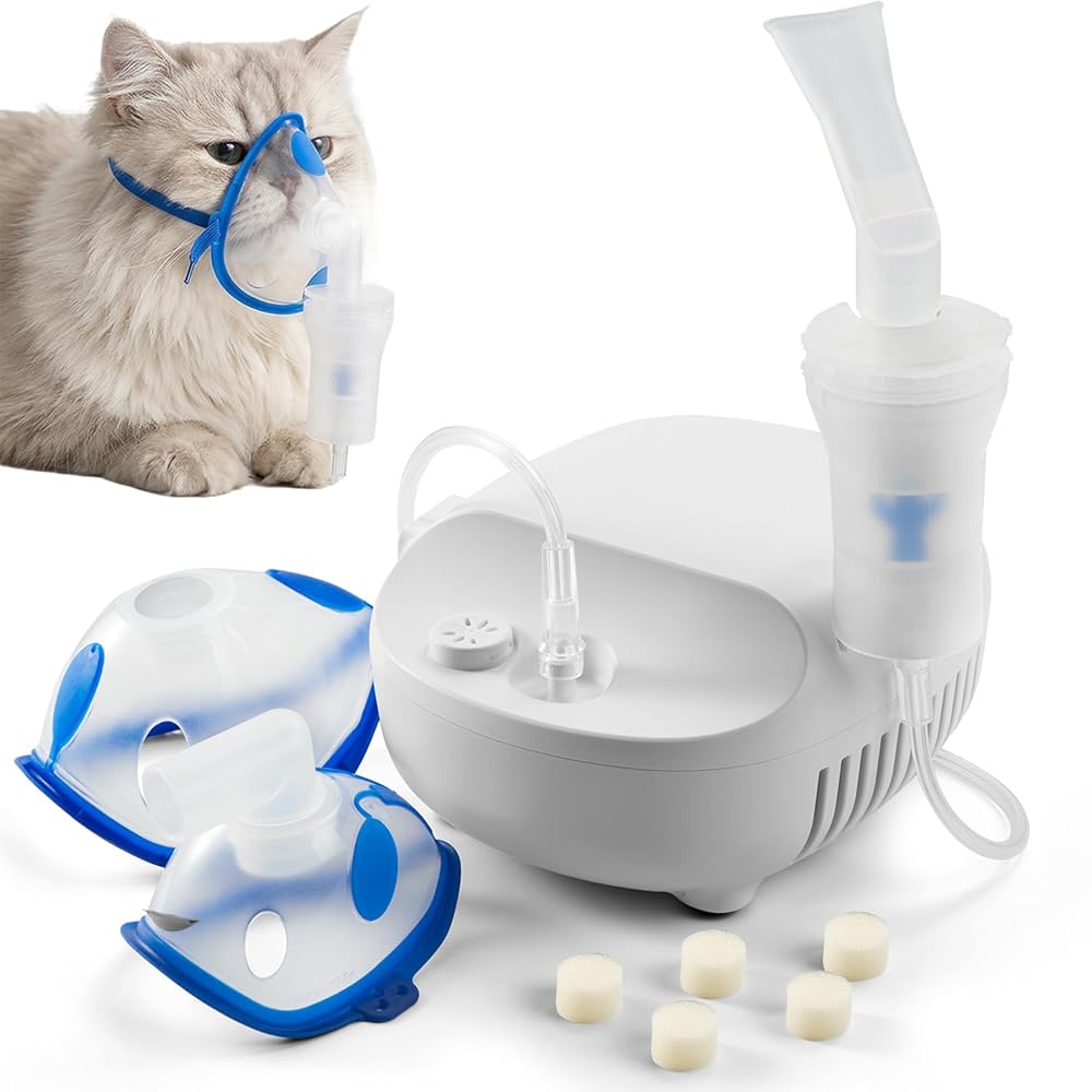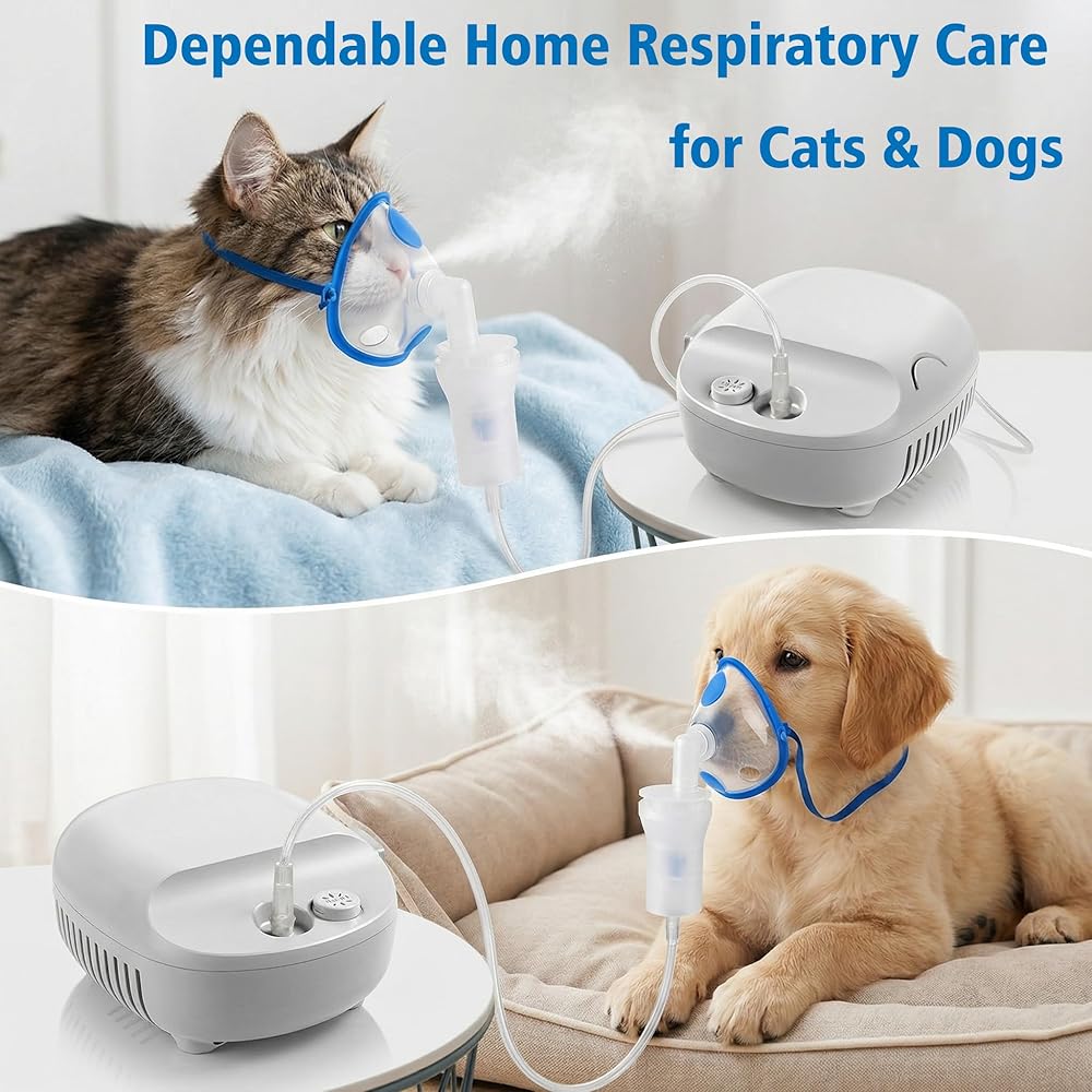 نظام ضاغط بيطري احترافي، مجموعة العناية التنفسية للحيوانات الأليفة عالية التدفق للقطط والكلاب، تشغيل هادئ للغاية مع قناعين مريحين من السيليكون، مخرج رذاذ قابل للتعديل للاستخدام في المنزل وأثناء السفر