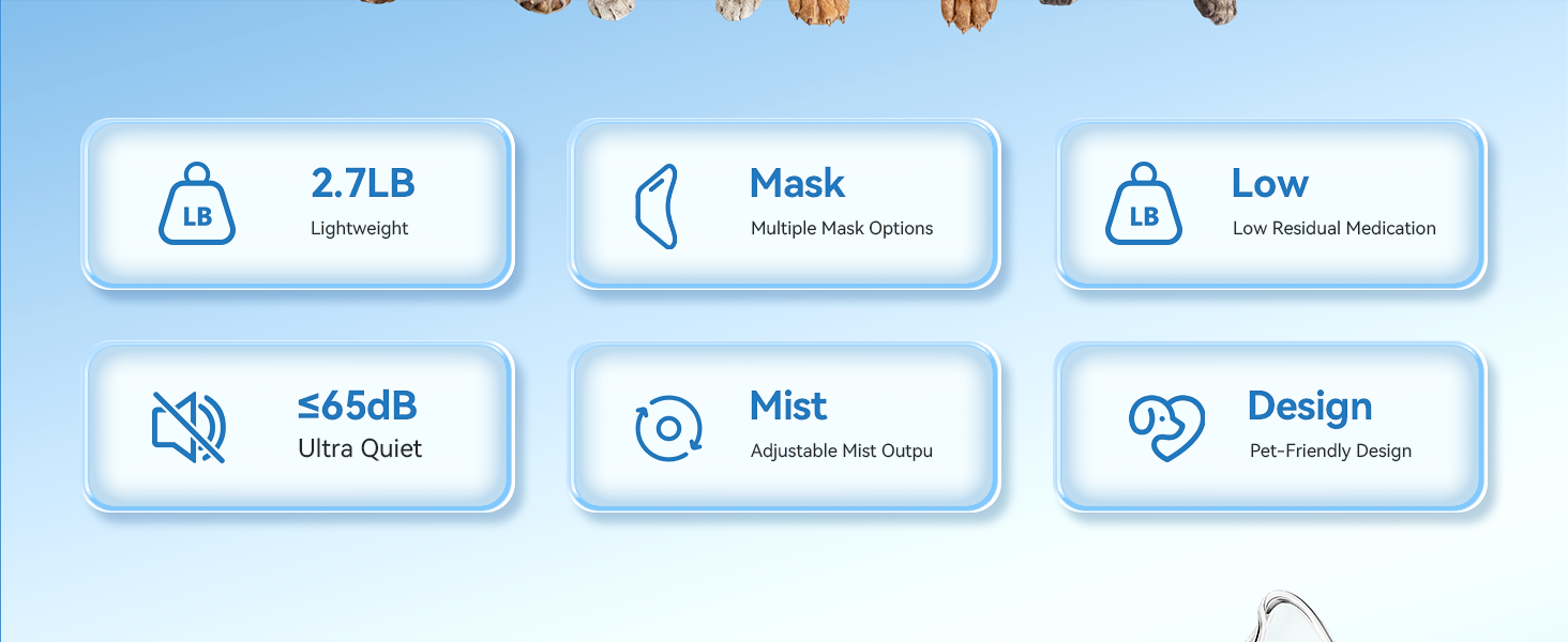 التحكم الدقيق في التدفق: يتيح الصمام القابل للتعديل يدويًا للمستخدمين تخصيص إخراج الرذاذ عبر نطاق مستمر يبدأ من ≥0.2 مل/دقيقة، مما يضمن العلاج الأمثل للحيوانات الأليفة ذات الأحجام والحساسيات المختلفة.