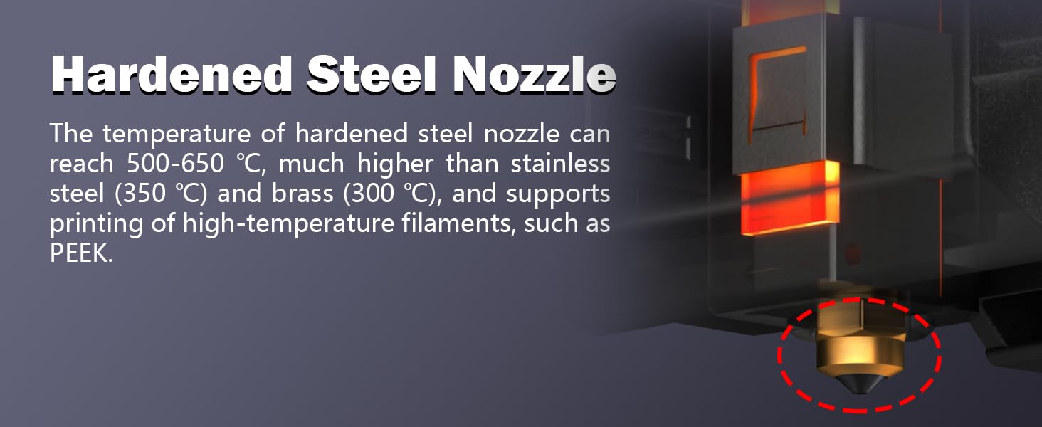 【فوهة فولاذية صلبة】: يمكن أن تصل درجة حرارة العمل القصوى للفوهة الفولاذية الصلبة إلى 500-650 درجة مئوية، وهي أعلى بكثير من الفولاذ المقاوم للصدأ (350 درجة مئوية) والنحاس (300 درجة مئوية)، وتدعم طباعة الشعيرات ذات درجة الحرارة العالية، مثل PEEK وPEI.