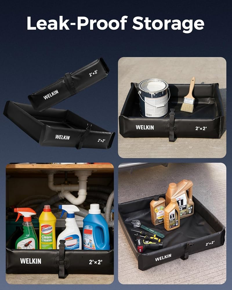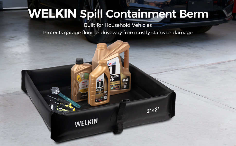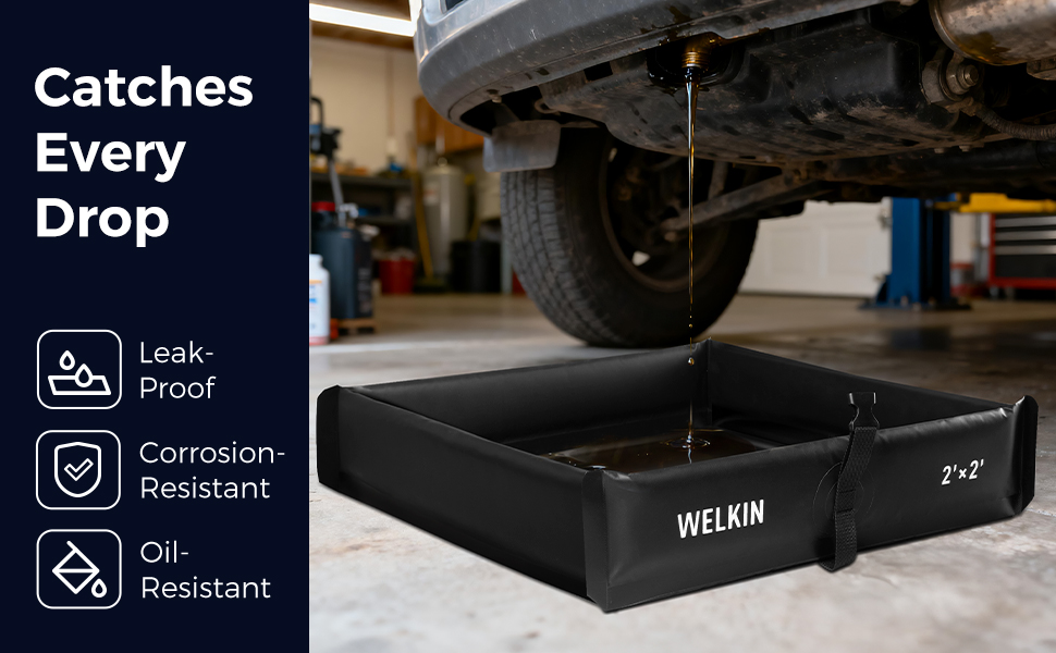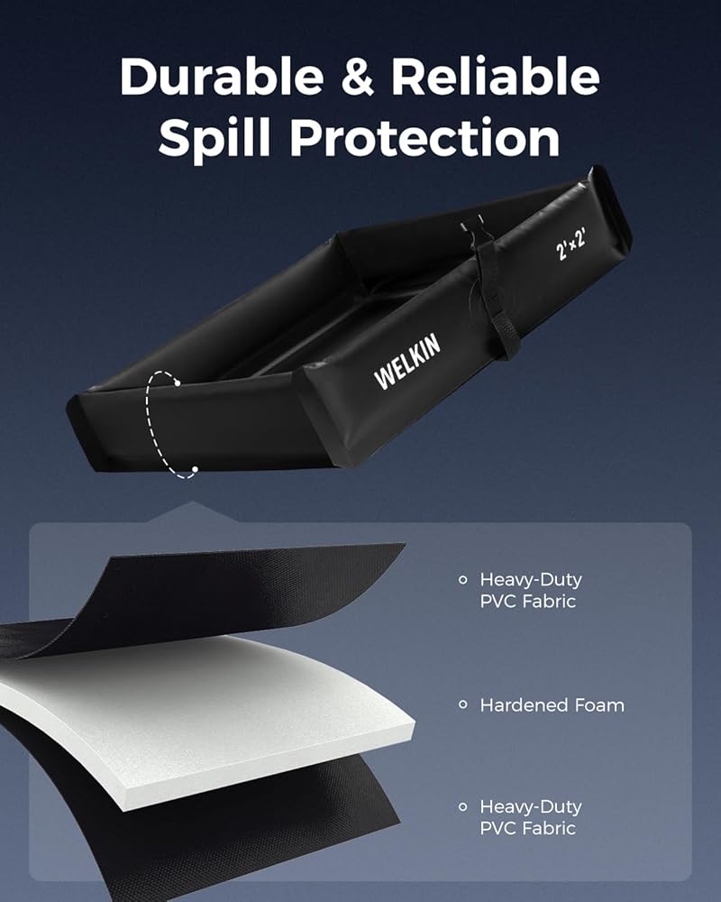 حماية موثوقة من الانسكابات: يتميز بنسيج PVC عالي التحمل يقاوم الأضرار الناجمة عن الزيوت والمبردات وسوائل الفرامل والمواد الكيميائية الأخرى، مما يوفر خصائص ممتازة مقاومة للتسرب والزيوت والتآكل. حاجز احتواء ممتاز بحرفية دقيقة، ومقاوم للاهتراء، ومتين للغاية وقابل لإعادة الاستخدام