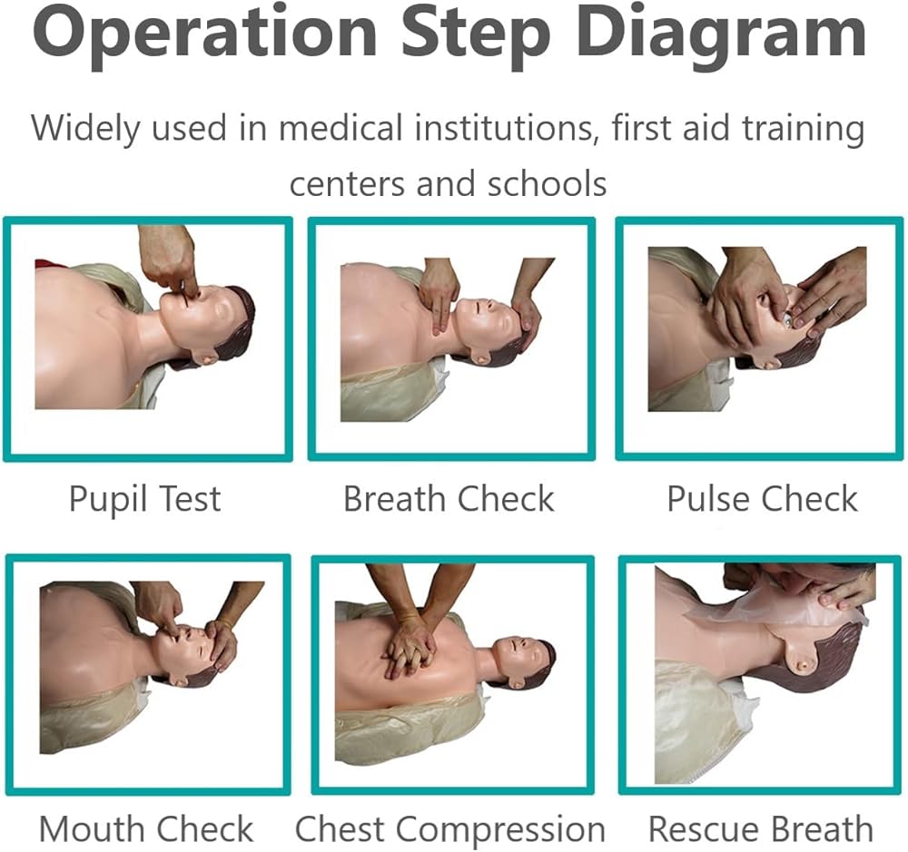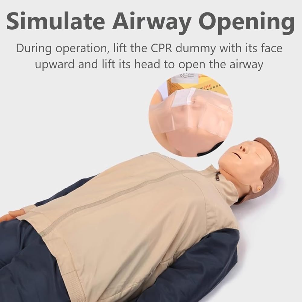 【قابلية تشغيل عالية】إن تشغيل دمى الإنعاش القلبي الرئوي هذه بسيط نسبيًا. يحتاج المدربون فقط إلى إجراء عمليات الضغط والتنفس وفقًا لتعليمات التدريب، وبالتالي ممارسة تقنيات الإسعافات الأولية وتحسينها بشكل فعال. في وضعية الاستلقاء، يمكن إمالة الرأس للخلف لتسهيل إزالة المواد الغريبة من الجهاز التنفسي. يمكن للتنفس الاصطناعي الفعال أن يُظهر ارتفاع الصدر وهبوطه