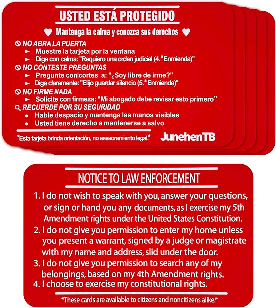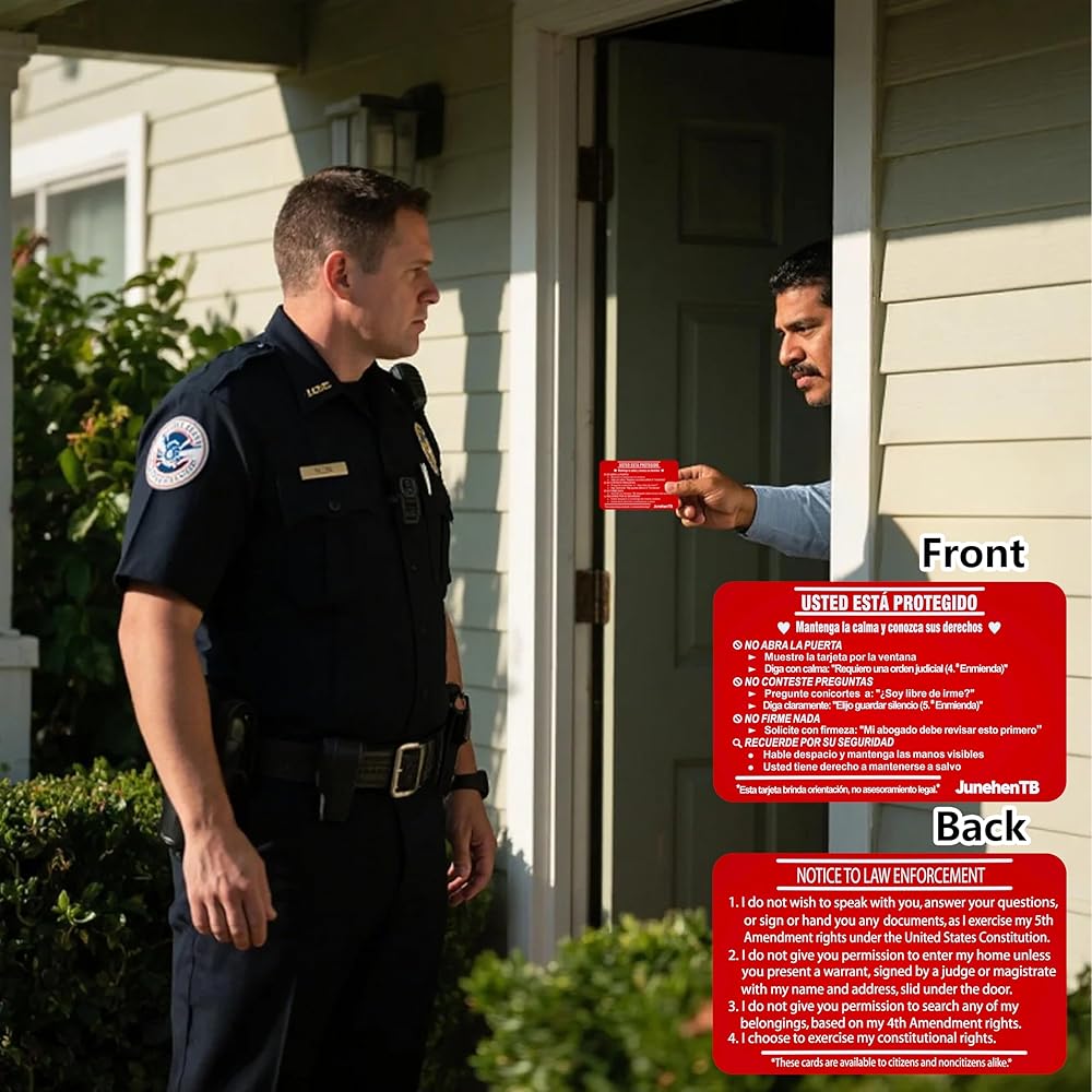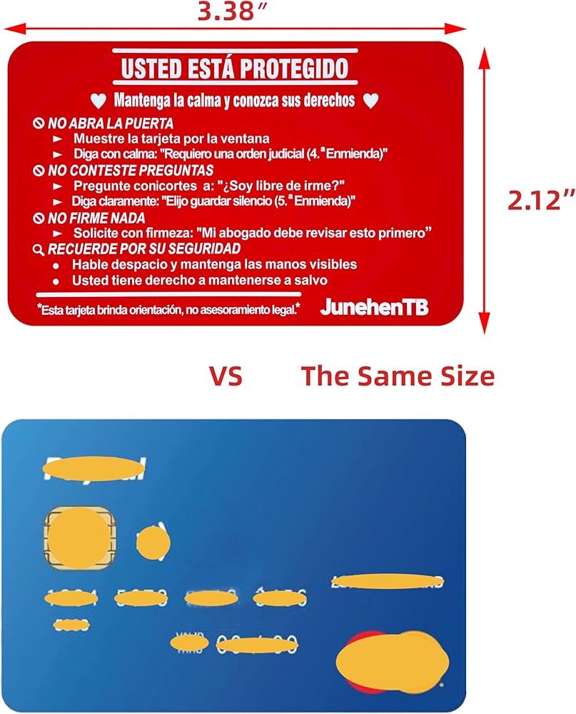 • أداة الحقوق الأساسية "Tarjeta Roja" – قم بتمكين نفسك أو عائلتك. الجانب الإسباني يأمر بوضوح: "لا Abra La Puerta" (لا تفتح الباب) و"No Firme Nada" (لا توقع على أي شيء). ما عليك سوى إظهار الجانب الإنجليزي من خلال النافذة أو فتحة البريد لرفض الدخول دون أمر قضائي واستدعاء حقك في الاستعانة بمحامي دون التحدث بكلمة واحدة.