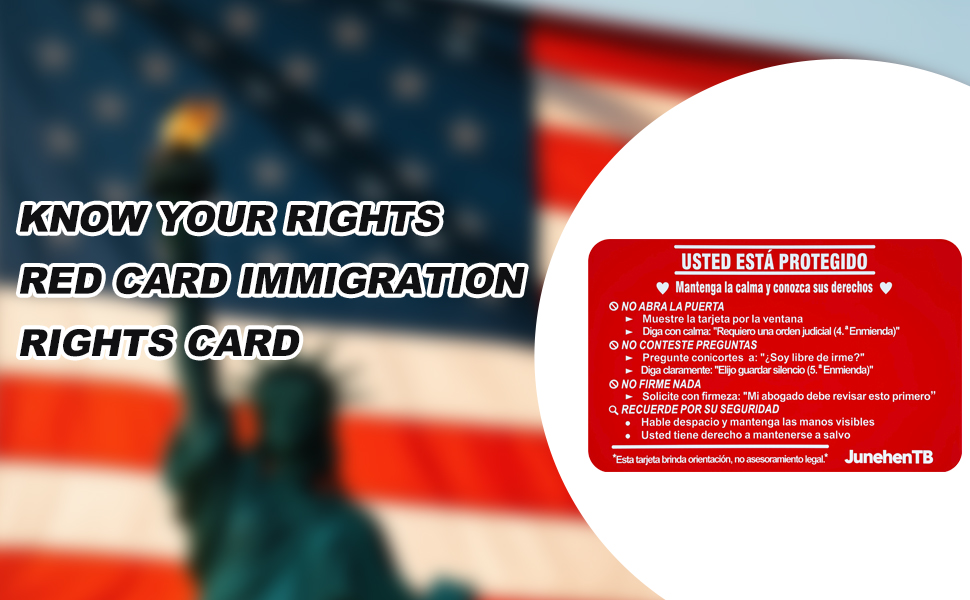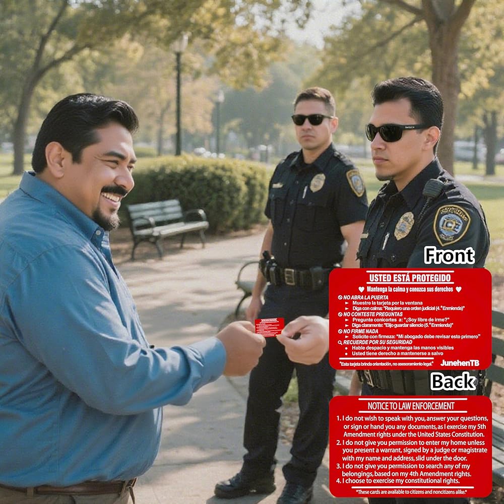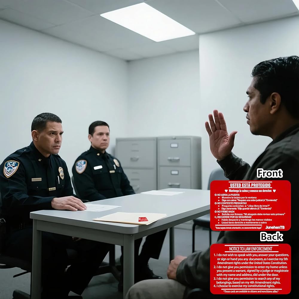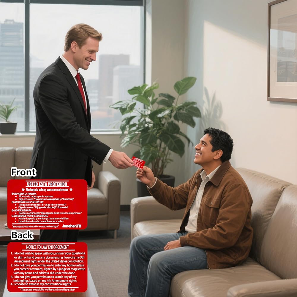 • أداة الحقوق الأساسية "Tarjeta Roja" – قم بتمكين نفسك أو عائلتك. الجانب الإسباني يأمر بوضوح: "لا Abra La Puerta" (لا تفتح الباب) و"No Firme Nada" (لا توقع على أي شيء). ما عليك سوى إظهار الجانب الإنجليزي من خلال النافذة أو فتحة البريد لرفض الدخول دون أمر قضائي واستدعاء حقك في الاستعانة بمحامي دون التحدث بكلمة واحدة.