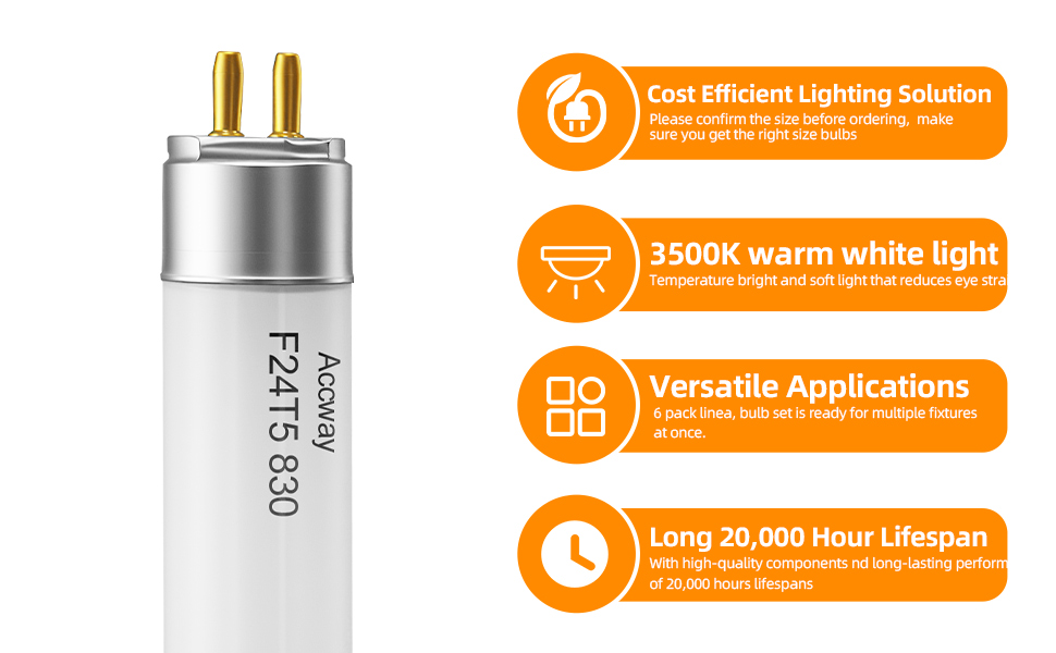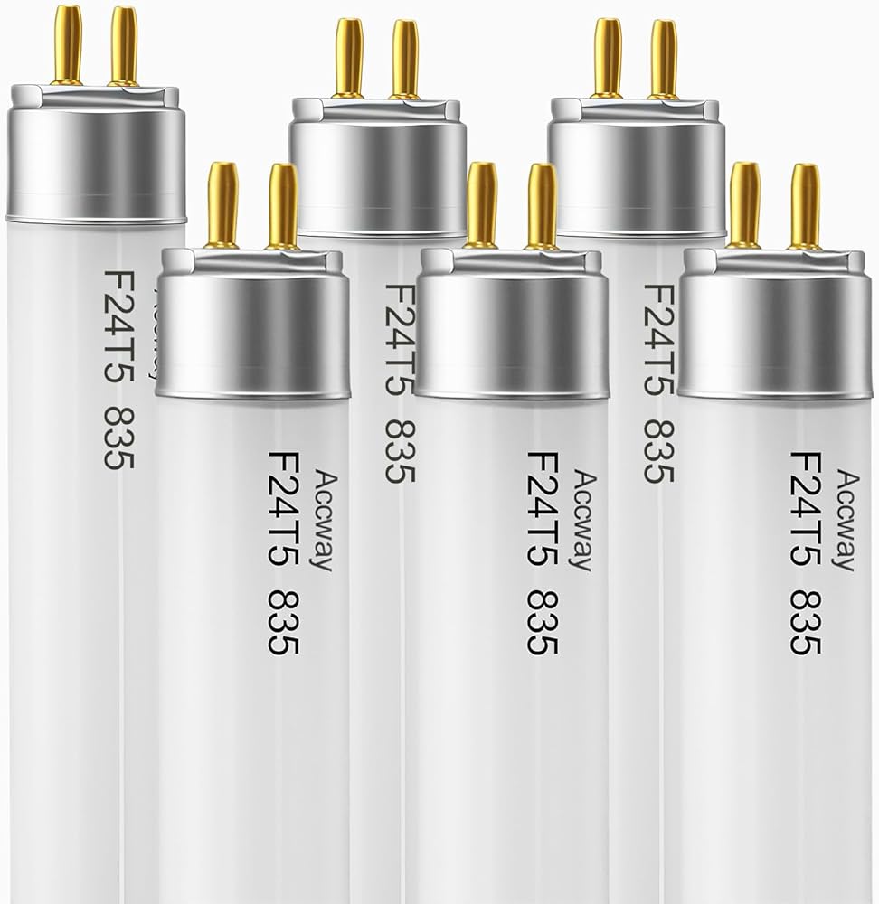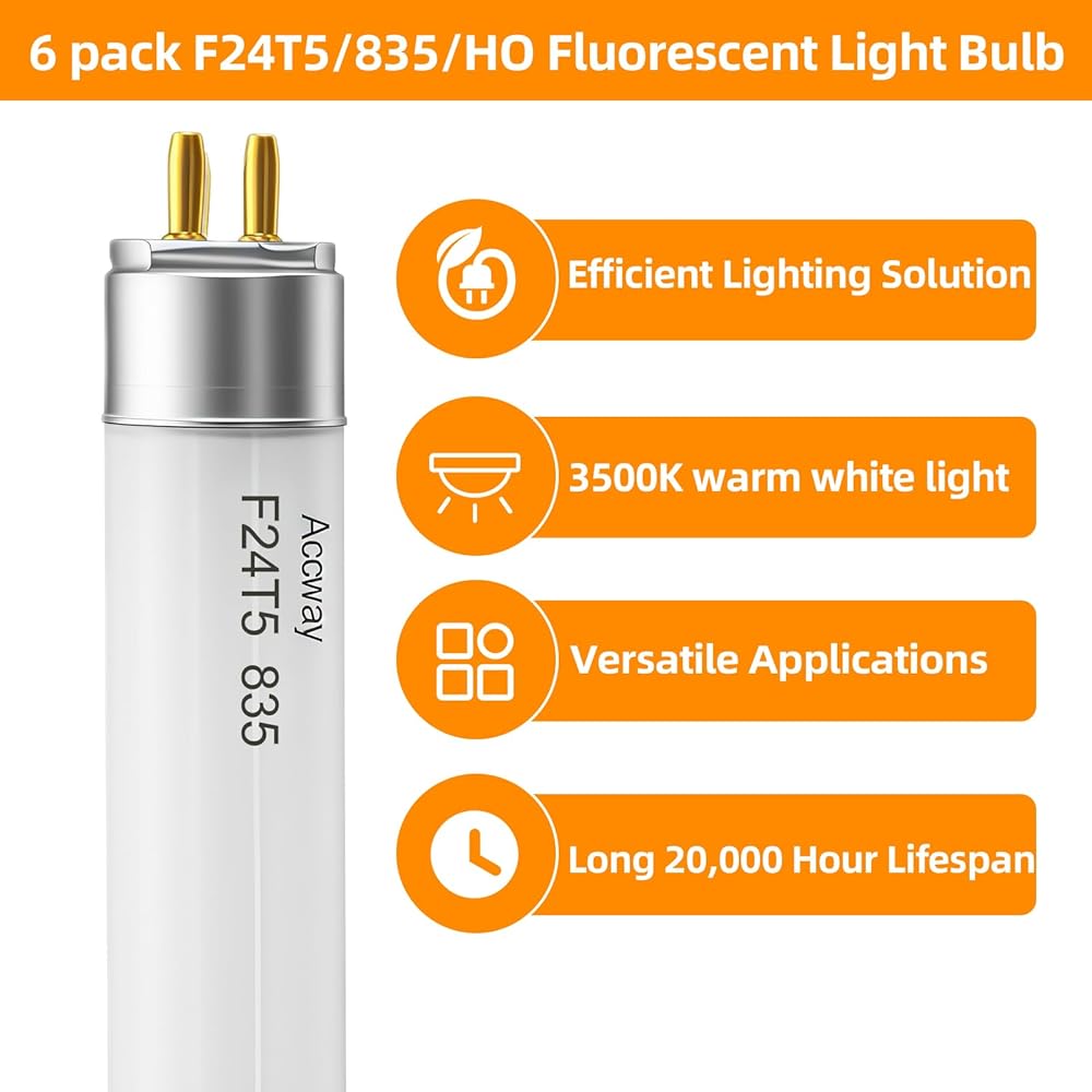 6 عبوات من مصابيح الفلورسنت F24T5/835/HO، أنبوب خطي T5 مقاس 22 بوصة، 24 وات 3500 ك، دافئ ناعم، خرج عالي 1800 لومن، 86 CRI، قاعدة G5 Mini Bi-Pi