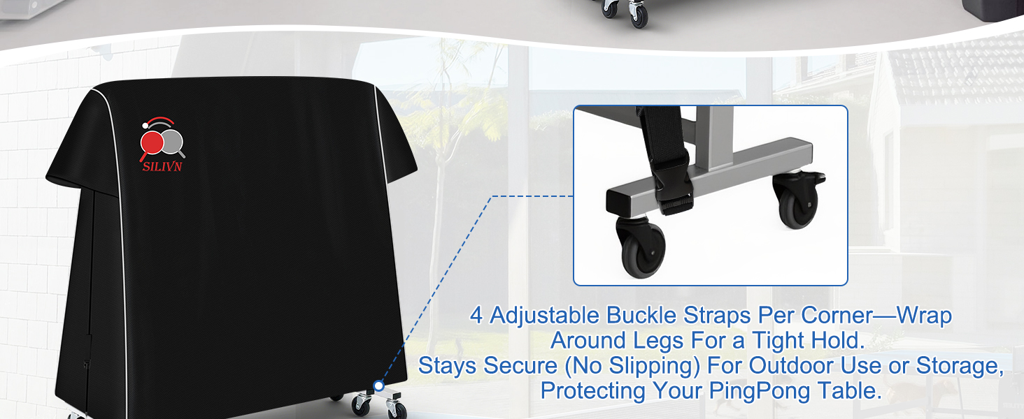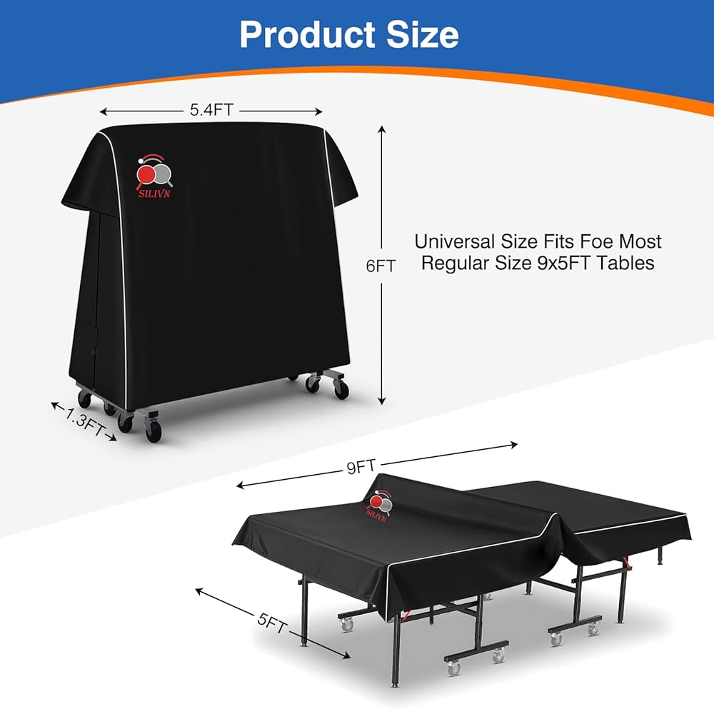 【ملاءمة عالمية لمعظم الطاولات】 مصممة خصيصًا لطاولات تنس الطاولة القياسية القابلة للطي مقاس 9x5 أقدام والمسطحة (مناسبة للنماذج الداخلية والخارجية)، فهي تناسب تمامًا بدون تجاعيد وتبقى ثابتة في مكانها. سواء قمت بتخزين طاولتك مطوية على الحائط أو استخدمتها بشكل مسطح على الأرض، فإنها تتكيف بسلاسة مع احتياجاتك - قل وداعًا للأغطية الفضفاضة والزلقة ومنخفضة الجودة!