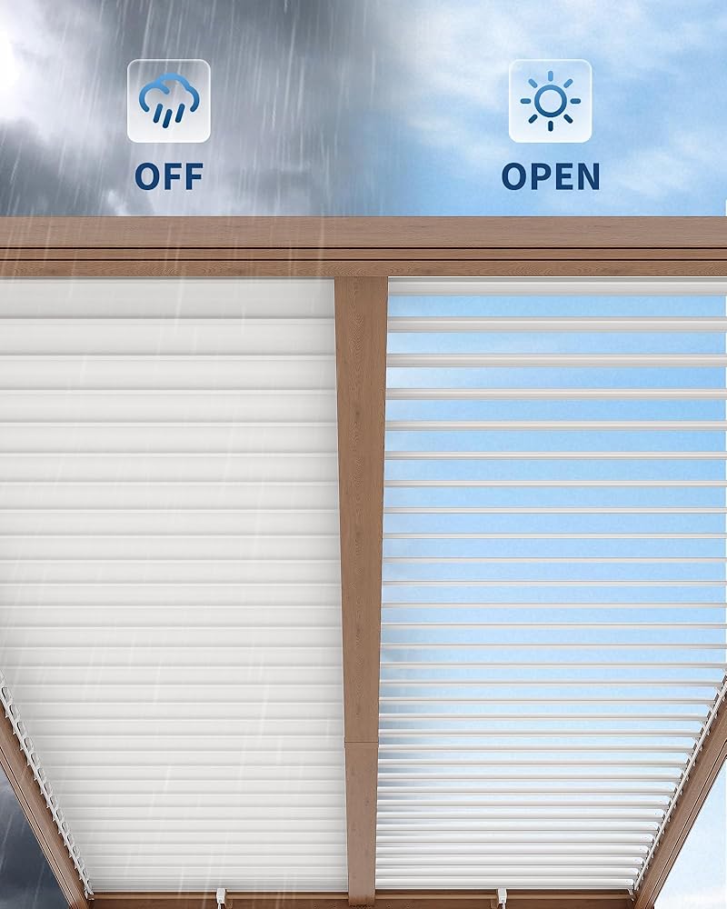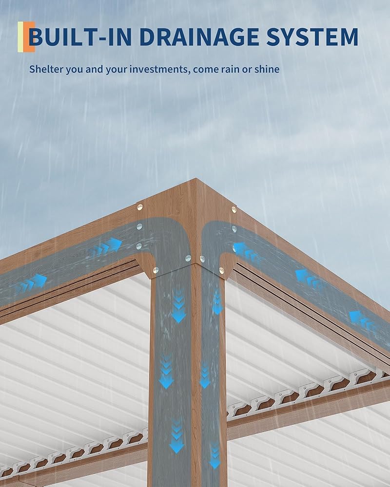 • Integrated Drainage System: Hidden gutters direct rainwater through reinforced columns, preventing leaks and puddles. Enjoy a dry and comfortable atmosphere under your pergolas for patios, even during downpours.