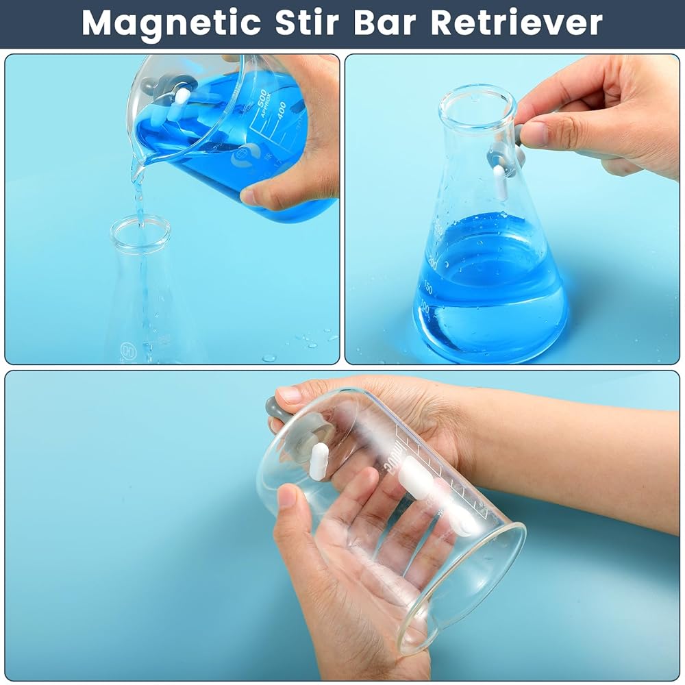 لوح تسخين محرك مغناطيسي، قضيب تحريك مغناطيسي مطلي بالتفلون، مسترد قضيب التحريك، حامل دعم مع حامل مقياس حرارة قابل للتعديل.
