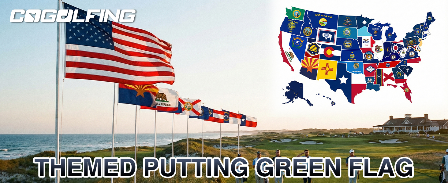موضوع فخر الدولة: مستوحاة من أعلام الولايات المتحدة الرسمية، تضيف أعلام الجولف الصغيرة هذه شخصية وتركيزًا بصريًا إلى الفناء الخلفي لوضع الخضر ونوادي الجولف والأحداث التي تحمل طابع الجولف.