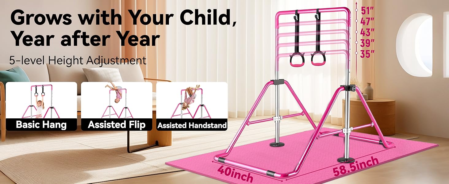 Adjustable for Growth: This kids gymnastics bar features 5 adjustable height levels (35 / 39 / 43 / 47 / 51 inches), making it suitable for children of different heights. Our gymnastic bar is designed to grow with your child, it's a long-term investment for fun and fitness, ideal for 3–8 years old kids