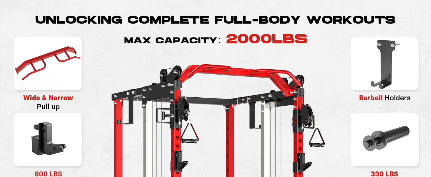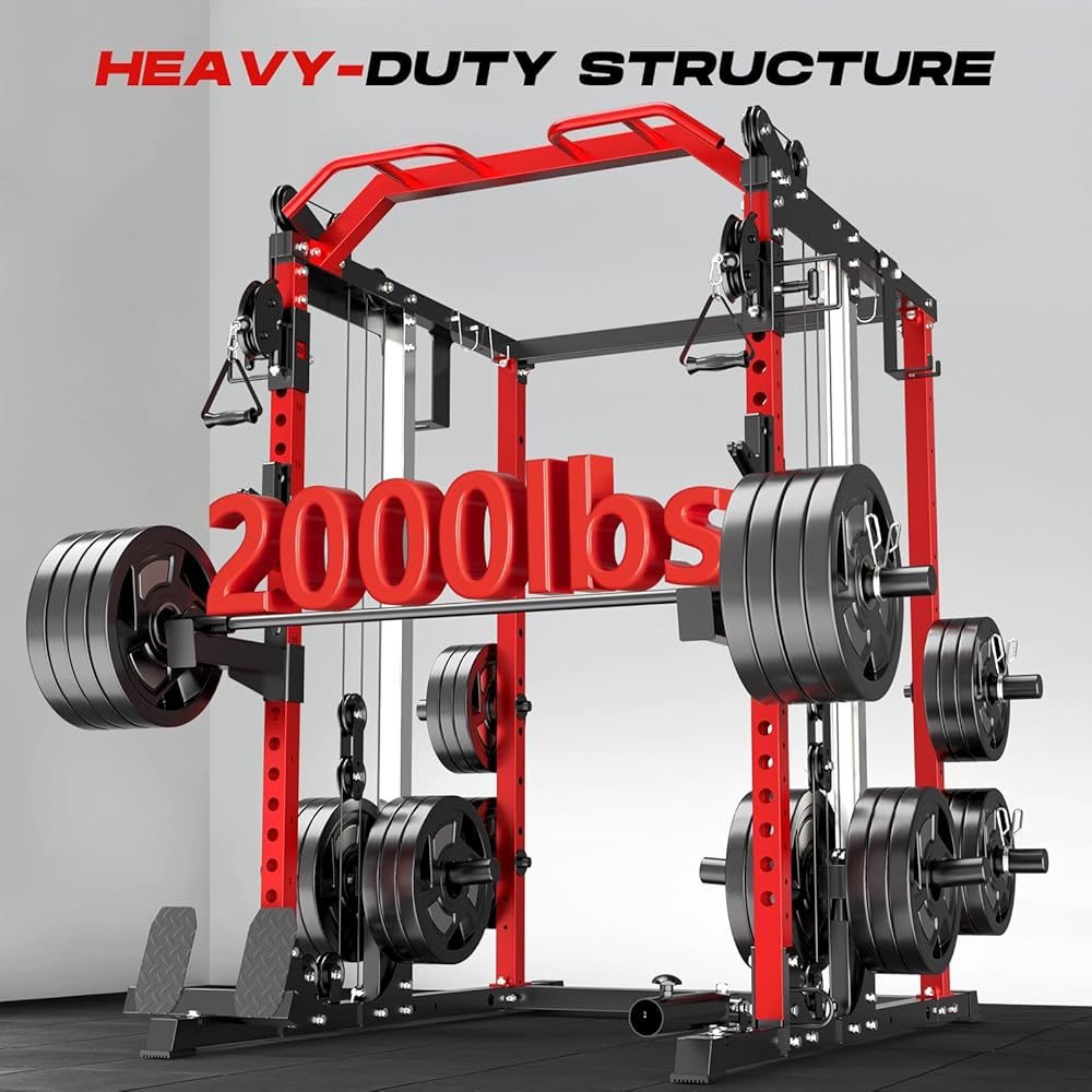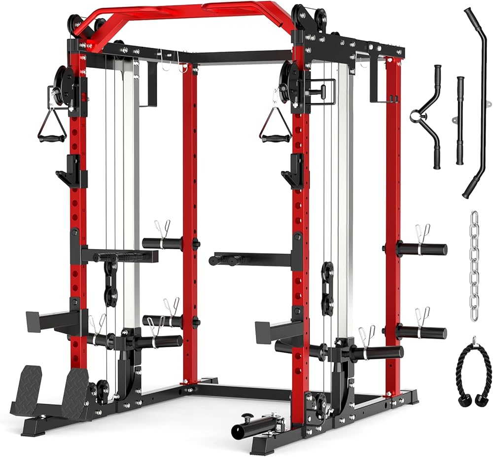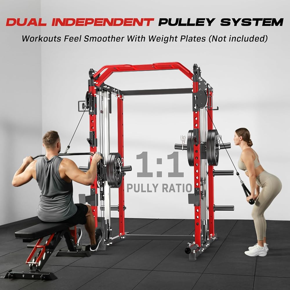 【All-in-One Smith Machine Home Gym】Maximize strength training in just 18.3 sq. ft. This multifunctional home gym combines a Smith machine, power cage, cable crossover, and pull-up station—perfect for squats, bench presses, rows, cable flys, dips, pull-ups, and more.