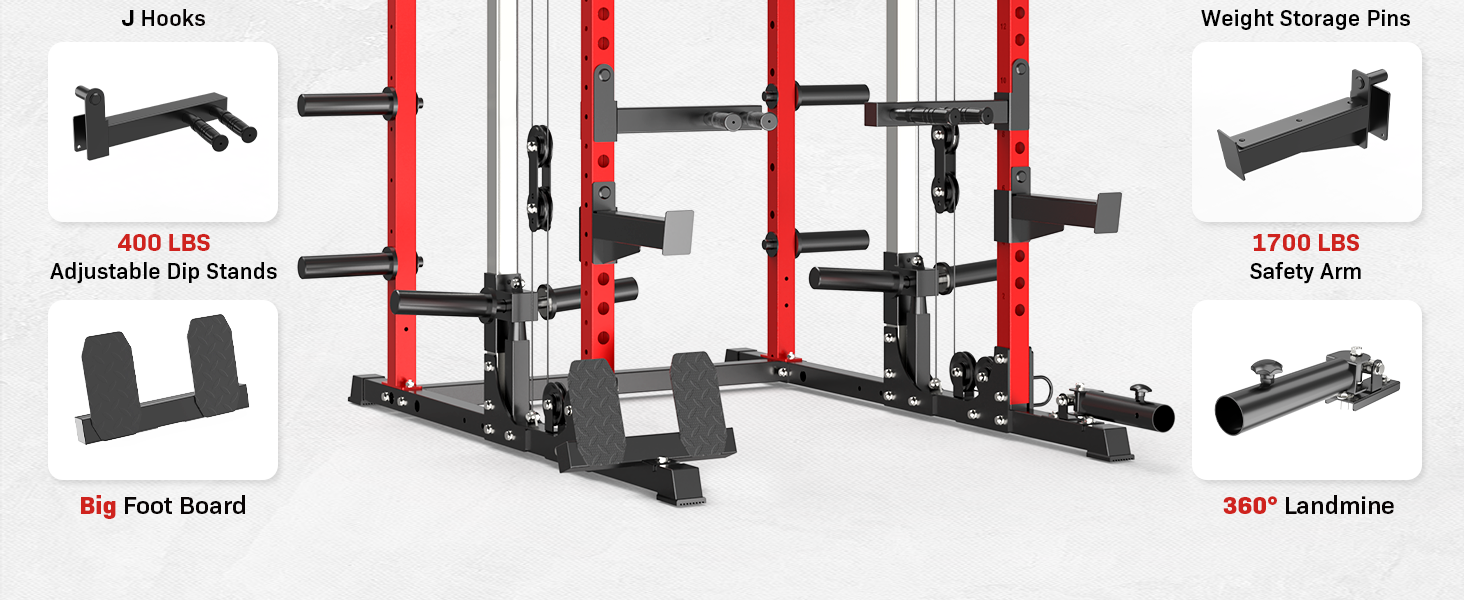 【Fully Equipped & Versatile】Includes all professional accessories for complete full-body workouts at home. The package includes: 360° Landmine ×1, Battle Rope Anchor ×1, Weight Storage Pins ×4, Barbell Holders ×2, Lat Pull Down Bar ×1, V Handle ×1, Rowing Bar ×1, Tricep Rope ×1, Cable Handles ×2, Foot Board ×1, J-Hooks ×2, Safety Arms ×2, Dip Bars ×2, Chain ×1, Barbell Spring Clamps ×8.