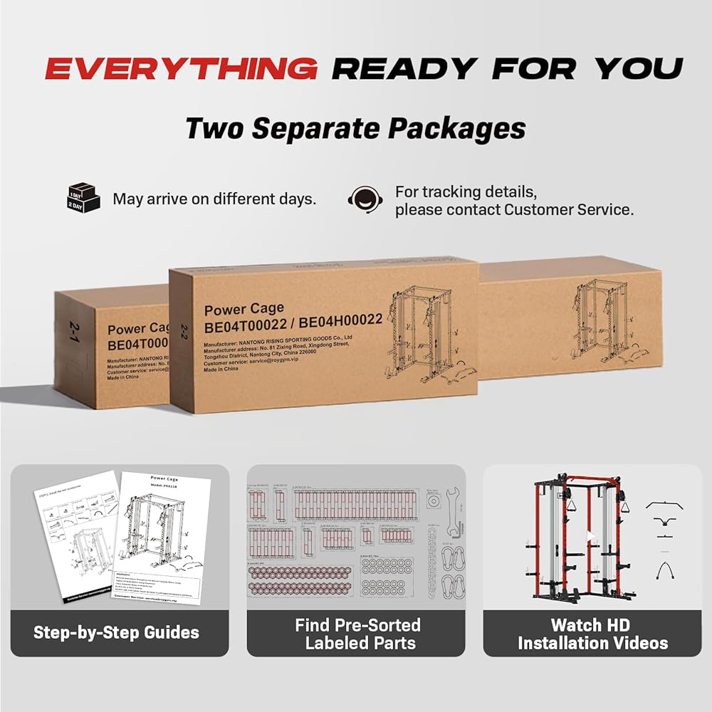 【No Worries】Delivered in two packages, which may arrive on different days. Your power cage comes with a 1-year cover for complete peace of mind. The support team is available 24 hours a day to provide prompt guidance and solutions, ensuring your cage stays safe, functional, and ready for every workout.