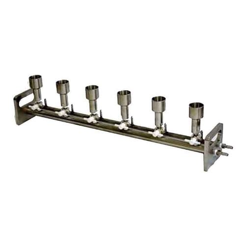 Lightweight and durable PVC material makes this extraction manifold a great alternative to stainless steel. Polyvinylchloride(PVC) is resistant to acids. The tapered branch accepts a 40/35 female joint to adapt to microanalysis units. The valve is PVC with a PTFE stopcock. The 3-way PVC valve with PTFE stopcock allows the manifold to be vented to atmosphere when used under closed conditions without breaking the vacuum connection. The valves luer slip vent port accepts a disposable syringe filter (13JP020AN) or KS13 holder with PTFE filter (J020A013A) to maintain sterility. The manifold outlet is 1/4"male to hose barb fitting connects to 3/8" id tubing. Not autoclavable.