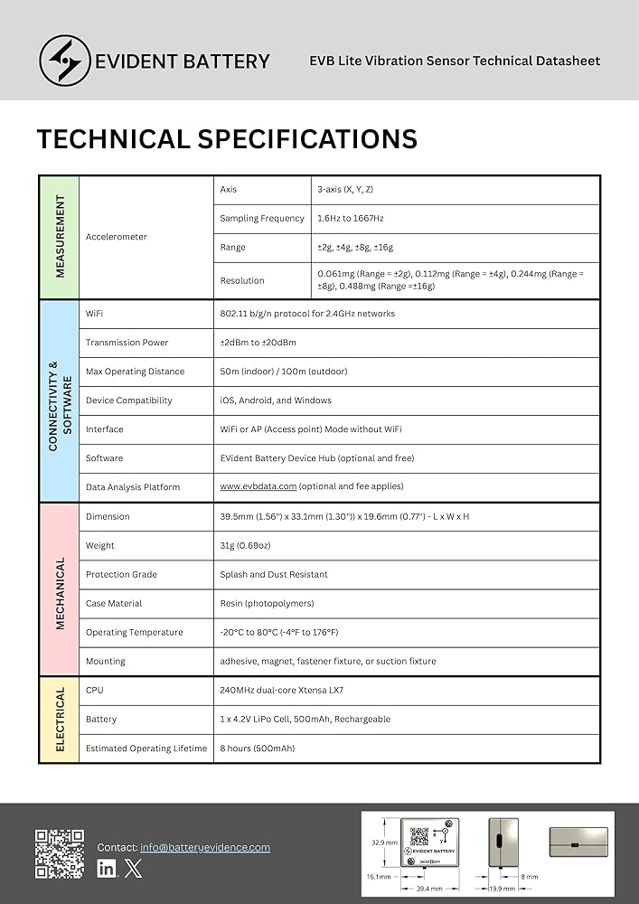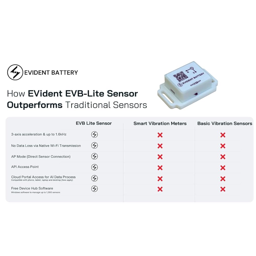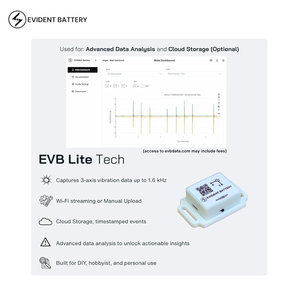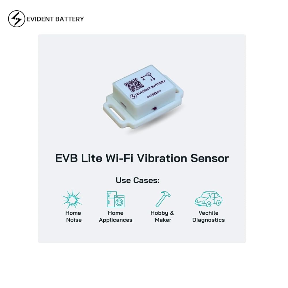 a. The EVB Lite Wi-Fi Vibration Sensor delivers accurate, timestamped vibration and motion data up to 1.6 kHz sampling rate using a 3-axis accelerometer, making it ideal for DIY projects, and hobbyist-level monitoring. b. Built with Wi-Fi (2.4 GHz) for real-time streaming and optional AP Mode for offline use, users can view data directly in their browser (Free) or connect to the EVident Platform (evbdata.com, fees apply) with no software installation required. c. EVB Lite pairs with the Free Device Hub Software, allowing users to link and manage up to 1,000 sensors from a single interface—ideal for small sensor networks. d. An onboard real-time clock timestamps every data packet, enabling consistent event tracking, comparison, and basic vibration analysis across sessions. e. Compact, lightweight, and affordable, EVB Lite is designed to lower the barrier to vibration monitoring for tinkering enthusiasts — without the complexity of enterprise-grade systems.