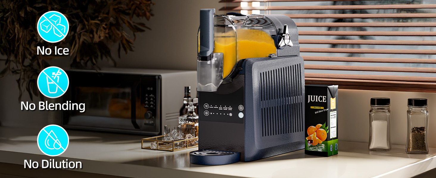 • لا حاجة للثلج، فقط العصائر! ✨ ننسى الفوضى والمتاعب! ما عليك سوى صب قاعدة مشروباتك المفضلة - العصير والصودا ومزيج الكوكتيل والقهوة والعصائر وحتى مخفوق الحليب. دع آلة السلاشي الخاصة بنا تعمل بسحرها! استمتع بالطين المخملي القابل للمغرفة في 15-60 دقيقة فقط.