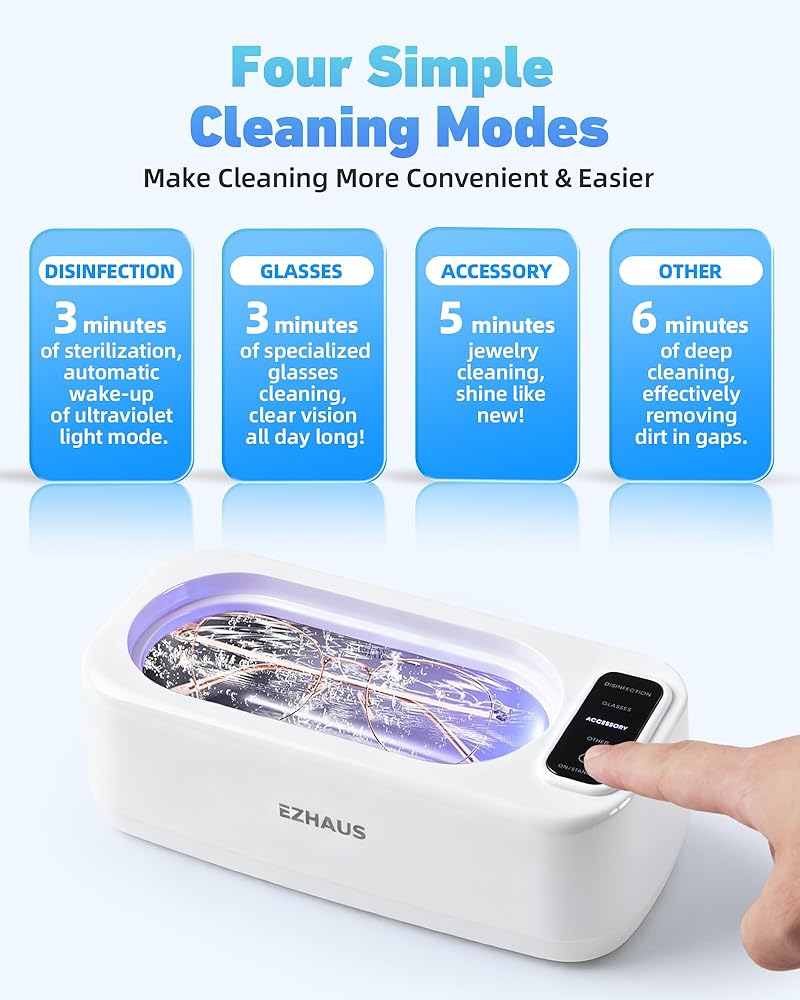 [أوضاع متعددة مطورة]: يتميز منظف المجوهرات الخاص بنا بأربعة أوضاع للتنظيف: التطهير لمدة 3 دقائق، والنظارات لمدة 3 دقائق، والمجوهرات لمدة 5 دقائق، والتنظيف لمدة 6 دقائق. وهذا يمنع الإفراط في تنظيف بعض العناصر ويمنع التشوه أو التفكك بسبب التعرض للموجات فوق الصوتية لفترة طويلة. (للحصول على نتائج تنظيف مثالية، يرجى استخدامه مع منظف.)