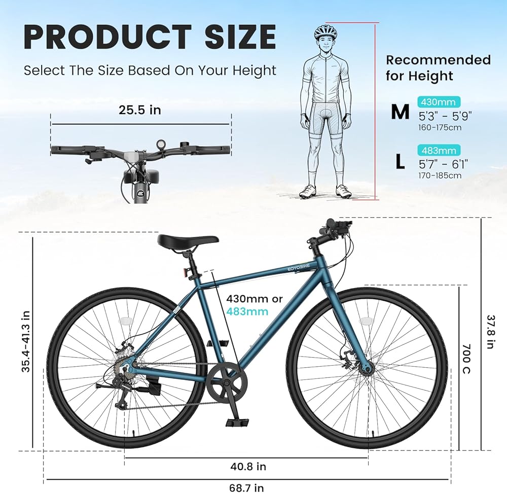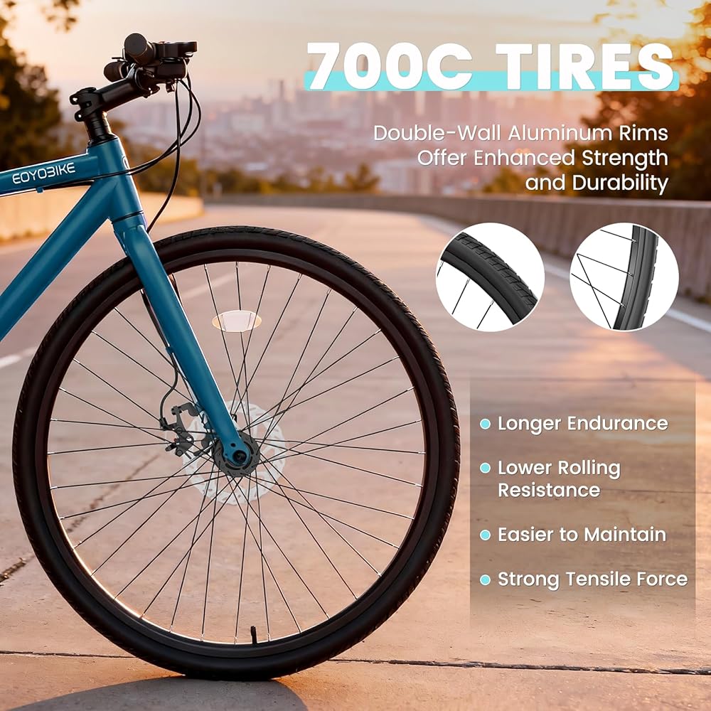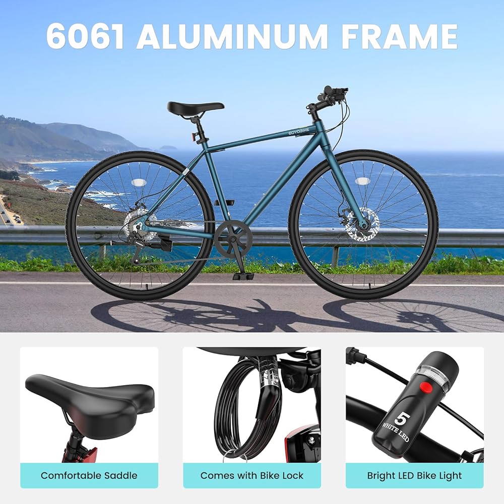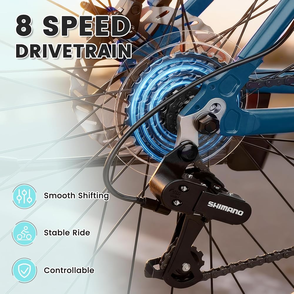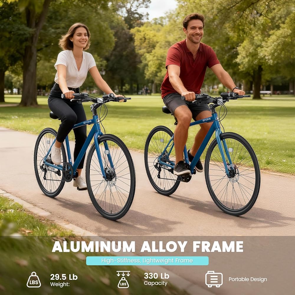 إطار ألومنيوم قوي وخفيف الوزن: تعامل مع كل رحلة بإطار ألومنيوم خفيف الوزن لكنه متين. صُممت هذه الدراجة لتدوم طويلاً وتدعم ما يصل إلى 330 رطلاً، مما يجعل كل رحلة آمنة وممتعة وبدون مجهود