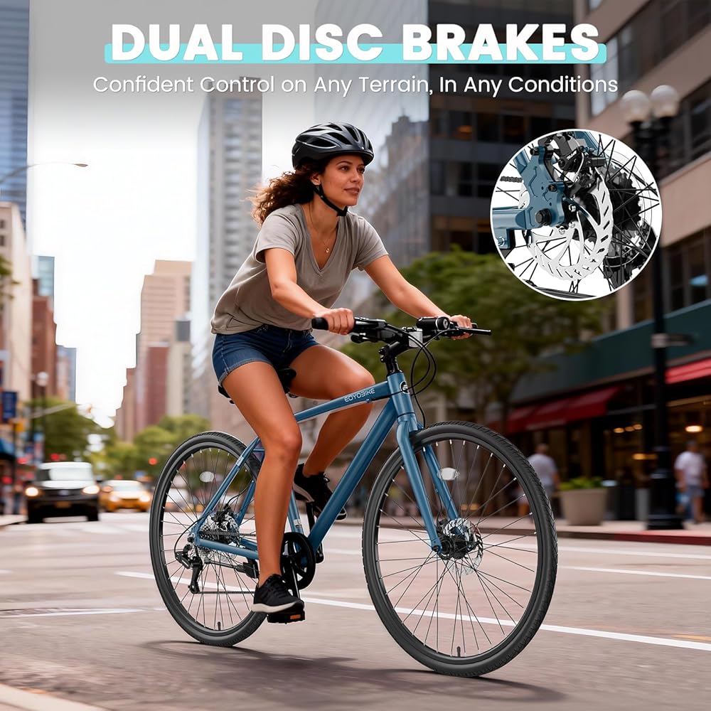 مكابح قوية وموثوقة: اشعر بالثقة مع فرامل قرصية مزدوجة توفر قوة توقف ثابتة في أي طقس. تضمن وسادات سبائك الألومنيوم أداءً يمكن الاعتماد عليه لركوب خالٍ من القلق