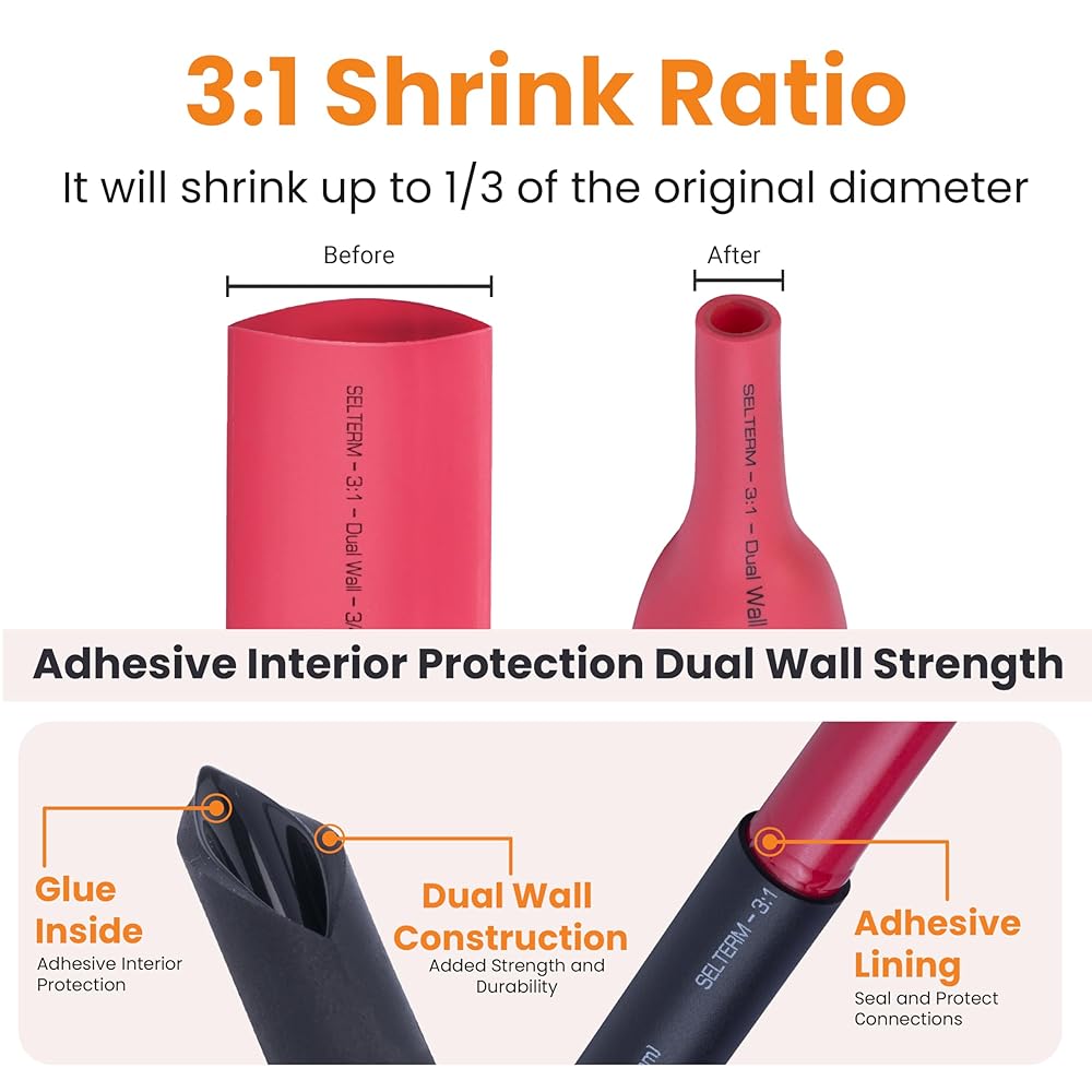 متانة مقاومة للحرارة: تأتي مجموعة أطراف كابل بطارية Selterm مع 12 قطعة 3: 1 أنابيب انكماش الحرارة باللونين الأسود والأحمر بمادة لاصقة؛ يوفر هذا الأنبوب عزلًا ممتازًا، ويحمي التوصيلات من الحرارة والرطوبة والتآكل، وبالتالي إطالة عمر إعداد البطارية