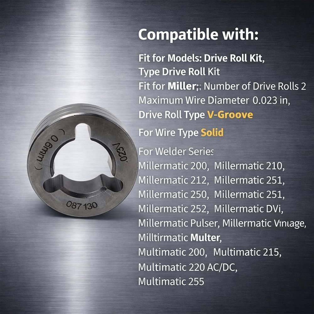 • 【Compatible With Models】Our product is compatible with models: Drive Roll Kit, Type Drive Roll Kit, fit for Miller, Number of Drive Rolls 2, Maximum Wire Diameter 0.023 in, Drive Roll Type V-Groove, for Wire Type Solid, for Welder Series Millermatic 200, Millermatic 210, Millermatic 212, Millermatic 250, Millermatic 251, Millermatic 252, Millermatic DVI, Millermatic Pulser, Millermatic Vintage, Multimatic 200, Multimatic 215, Multimatic 220 AC/DC, Multimatic 255