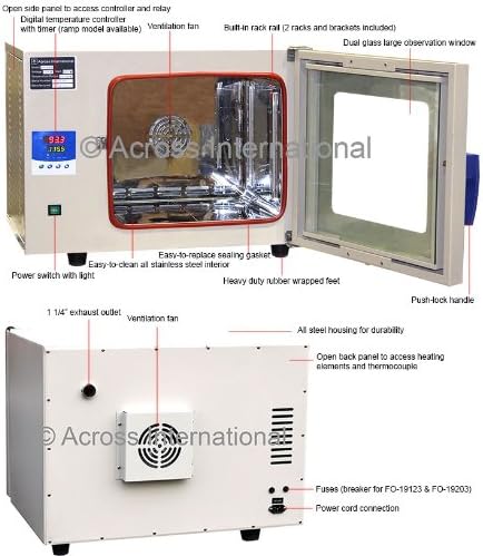 FO-19053 forced air ovens use digital micro-computer temperature control to enhance precision, accuracy and uniformity. Memory function memorizes all you settings when power is down, and resumes previous oven operation when power is back up. Alarm can also be set when actual working temperature is not within desired setup range.