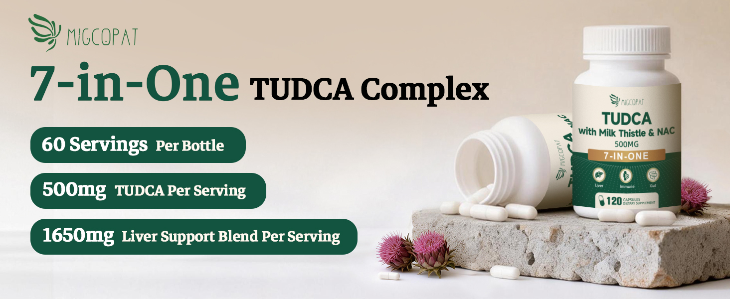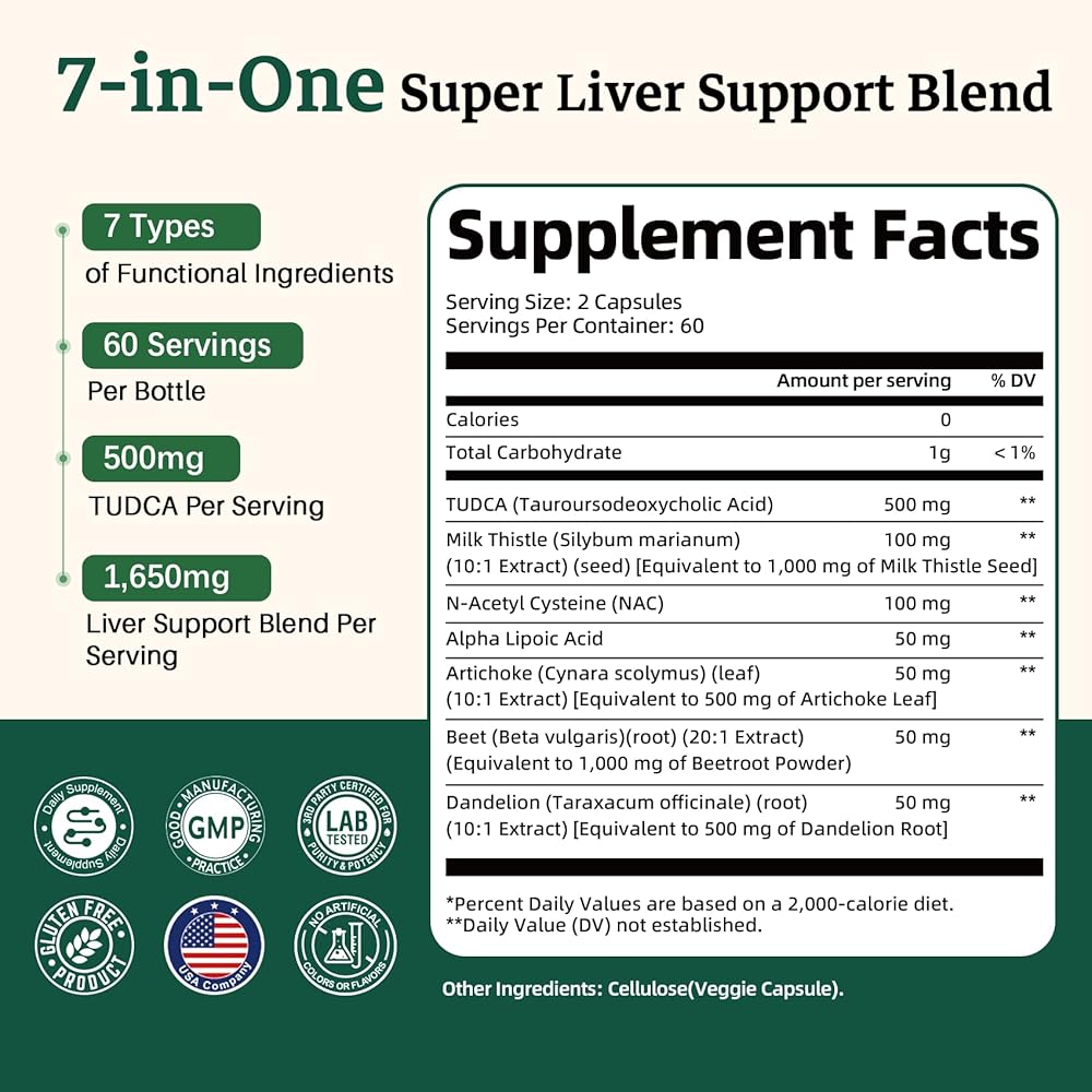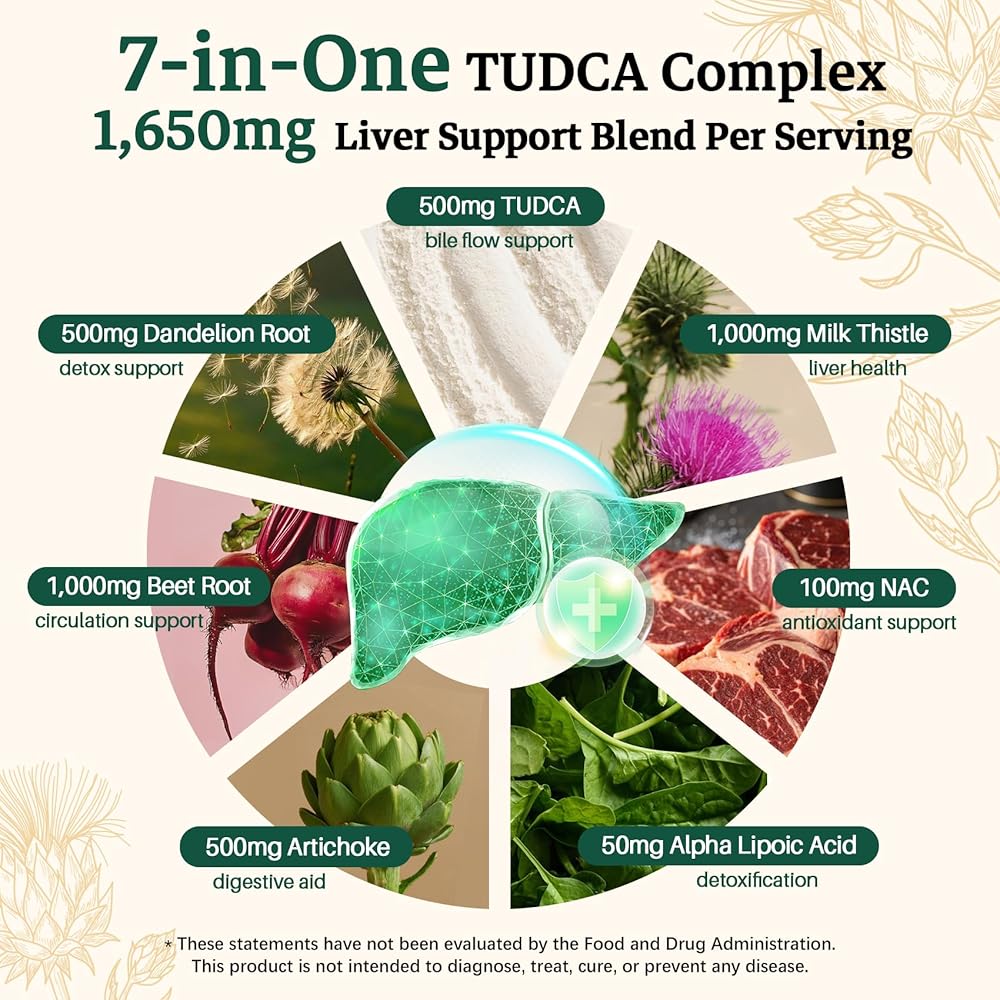 مكمل TUDCA 7 في واحد، 3650 مجم مع شوك الحليب، NAC، حمض ألفا ليبويك، جذر الهندباء، أملاح الصفراء TUDCA لتنظيف الكبد من السموم وإصلاحه، تدفق الصفراء ودعم الجهاز الهضمي - 120 كبسولة